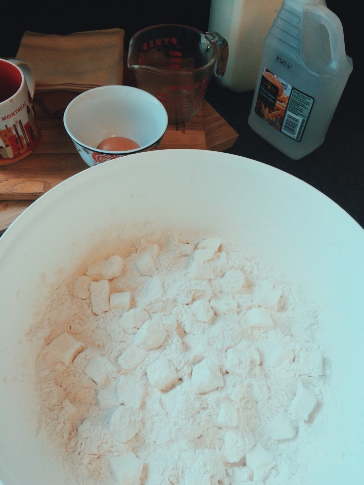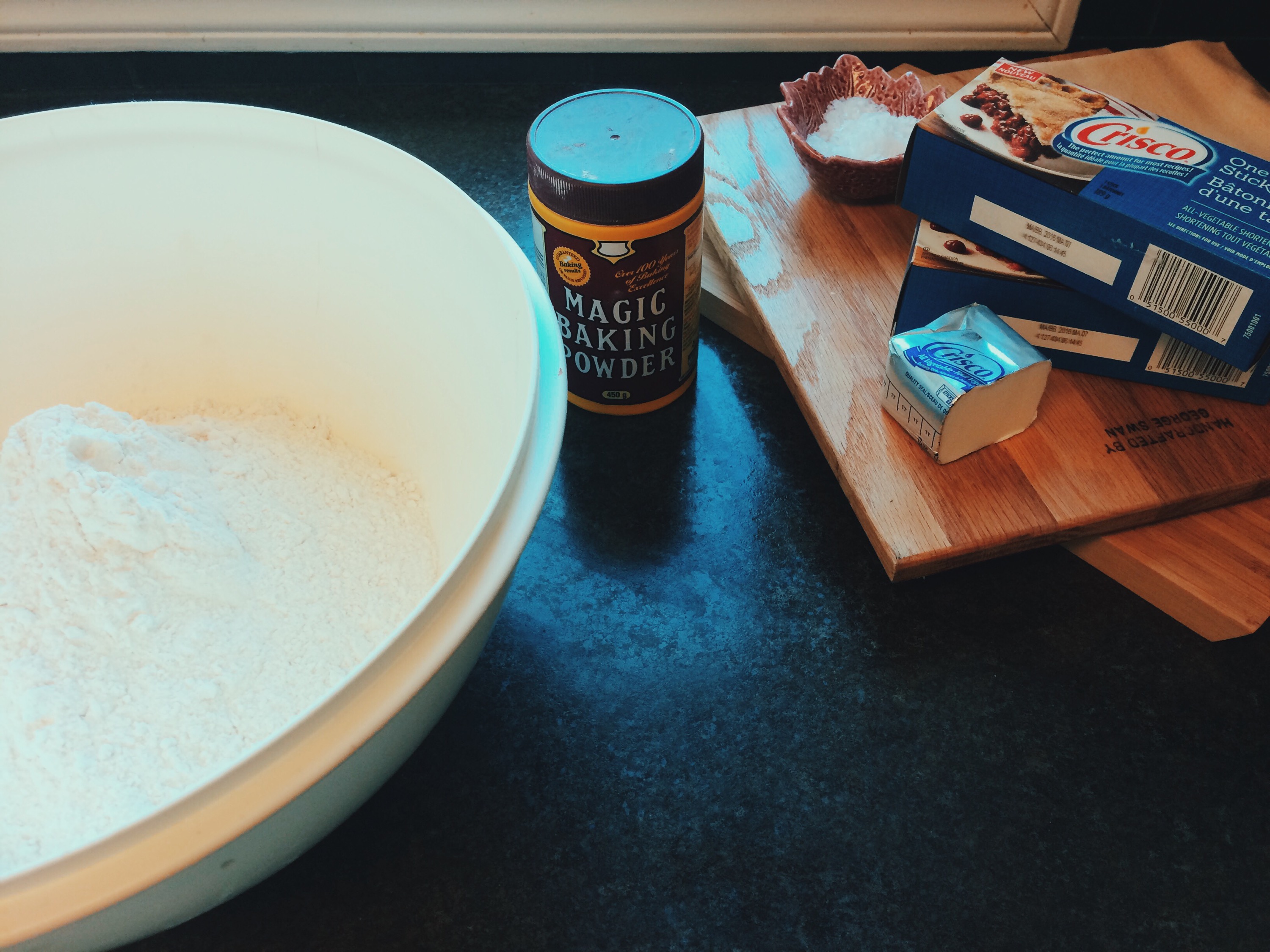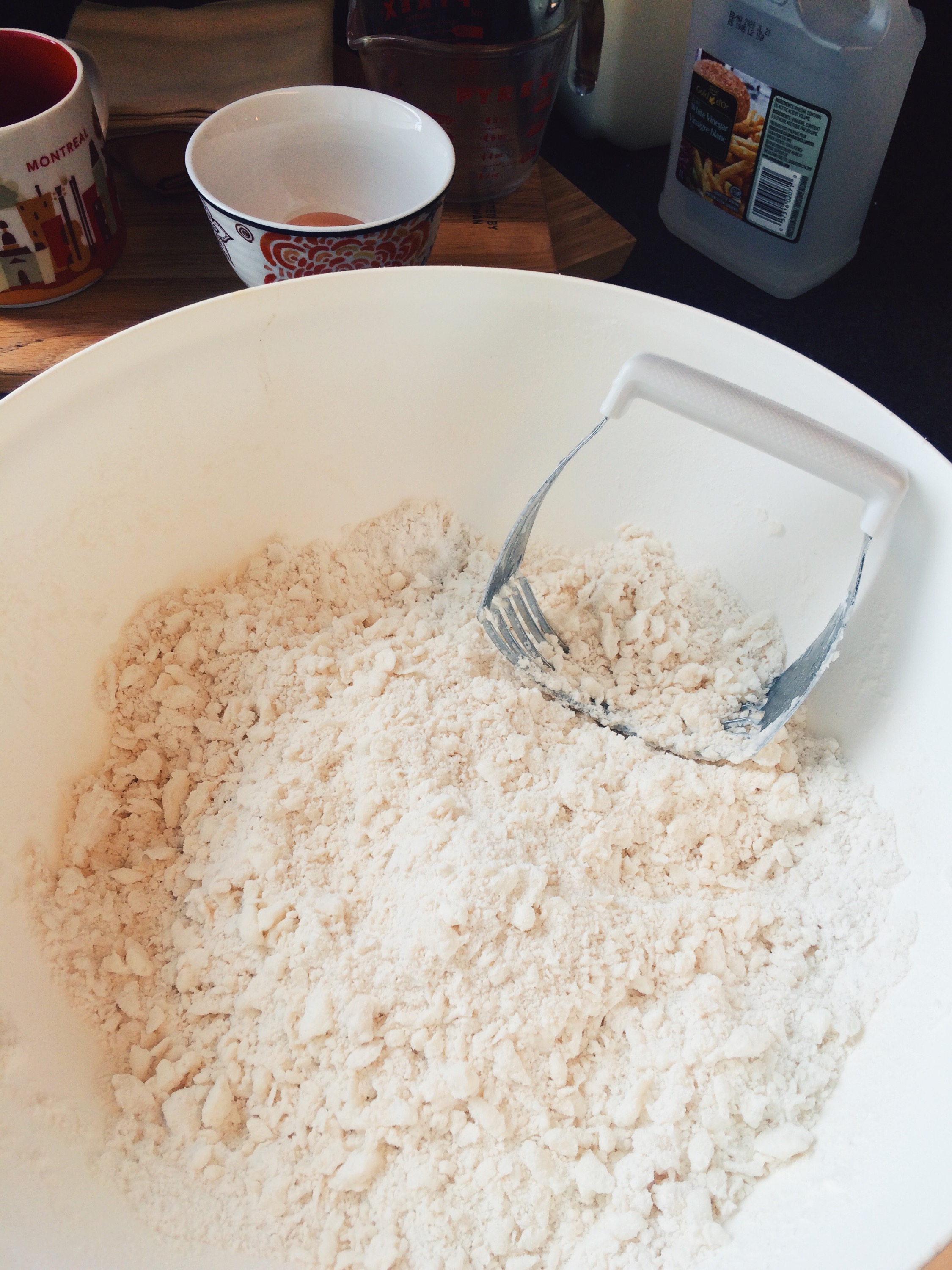 my Grandma passed away after struggling with Parkinson’s and left to me her pie plates, rolling pin and so many memories of making pies together… when I first got married and realized I might need to make the odd pie… she mixed up in a old white ice cream container (the really big ones) the base of the pie dough… the flour, lard, baking powder and salt… and then you’d just have to grab some of this and add the egg, vinegar, water mix and you’re set…
