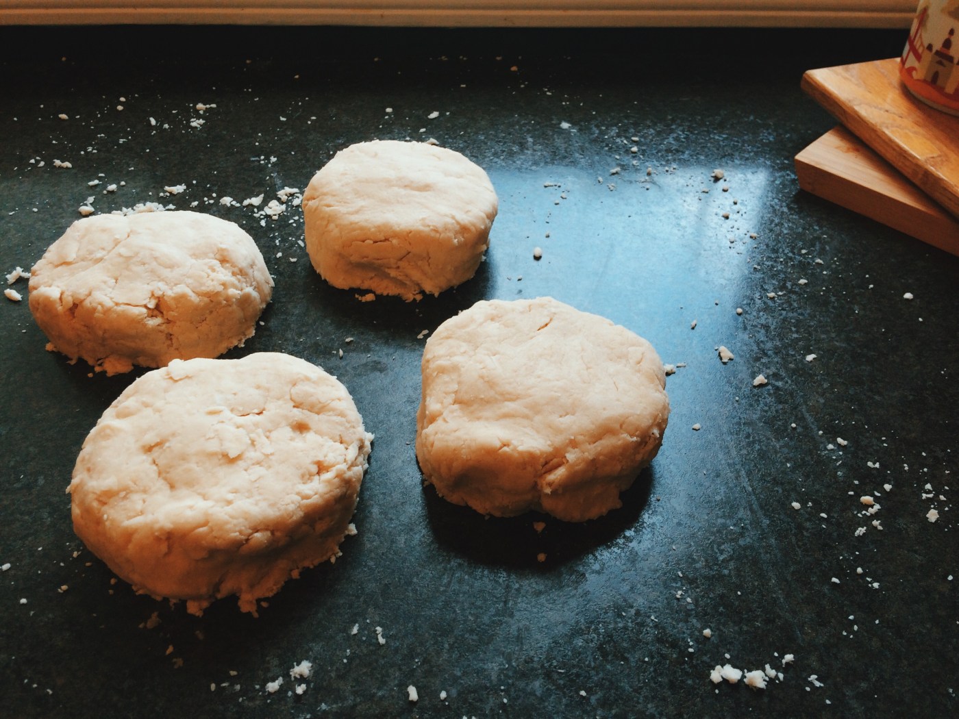 - mix the flour, baking powder and salt and cut in with a pastry blender the lard