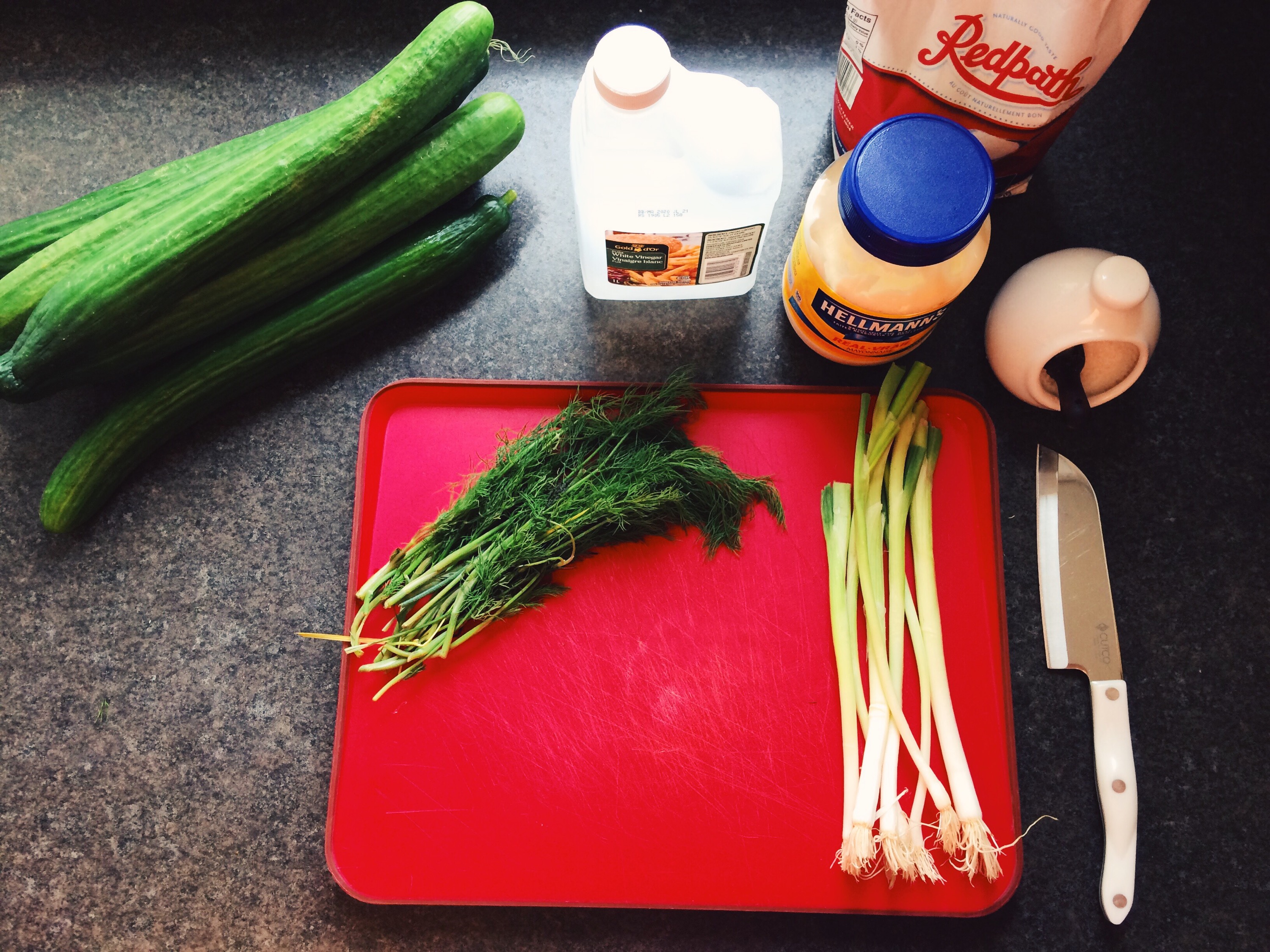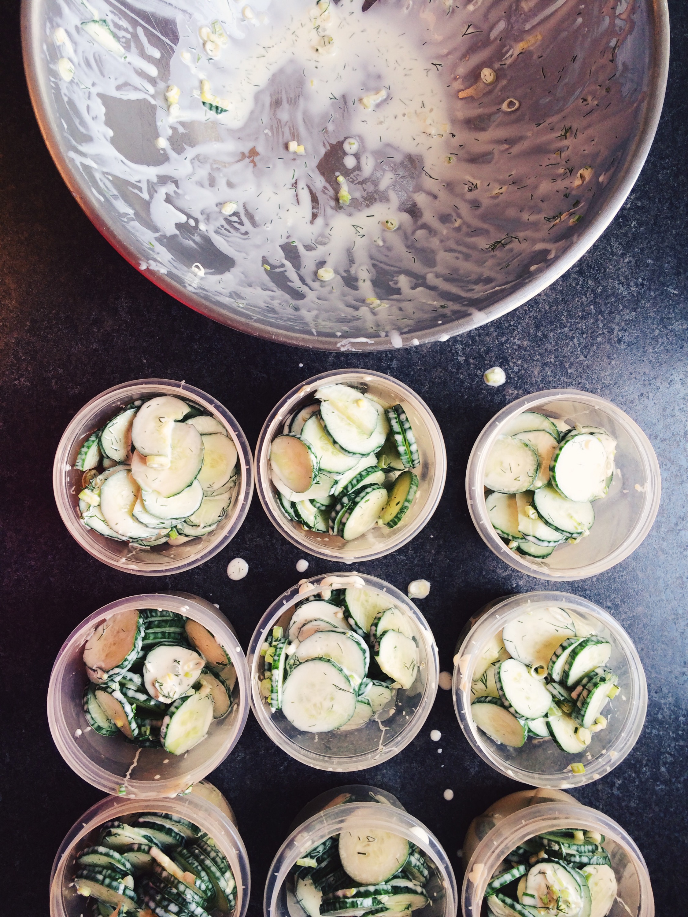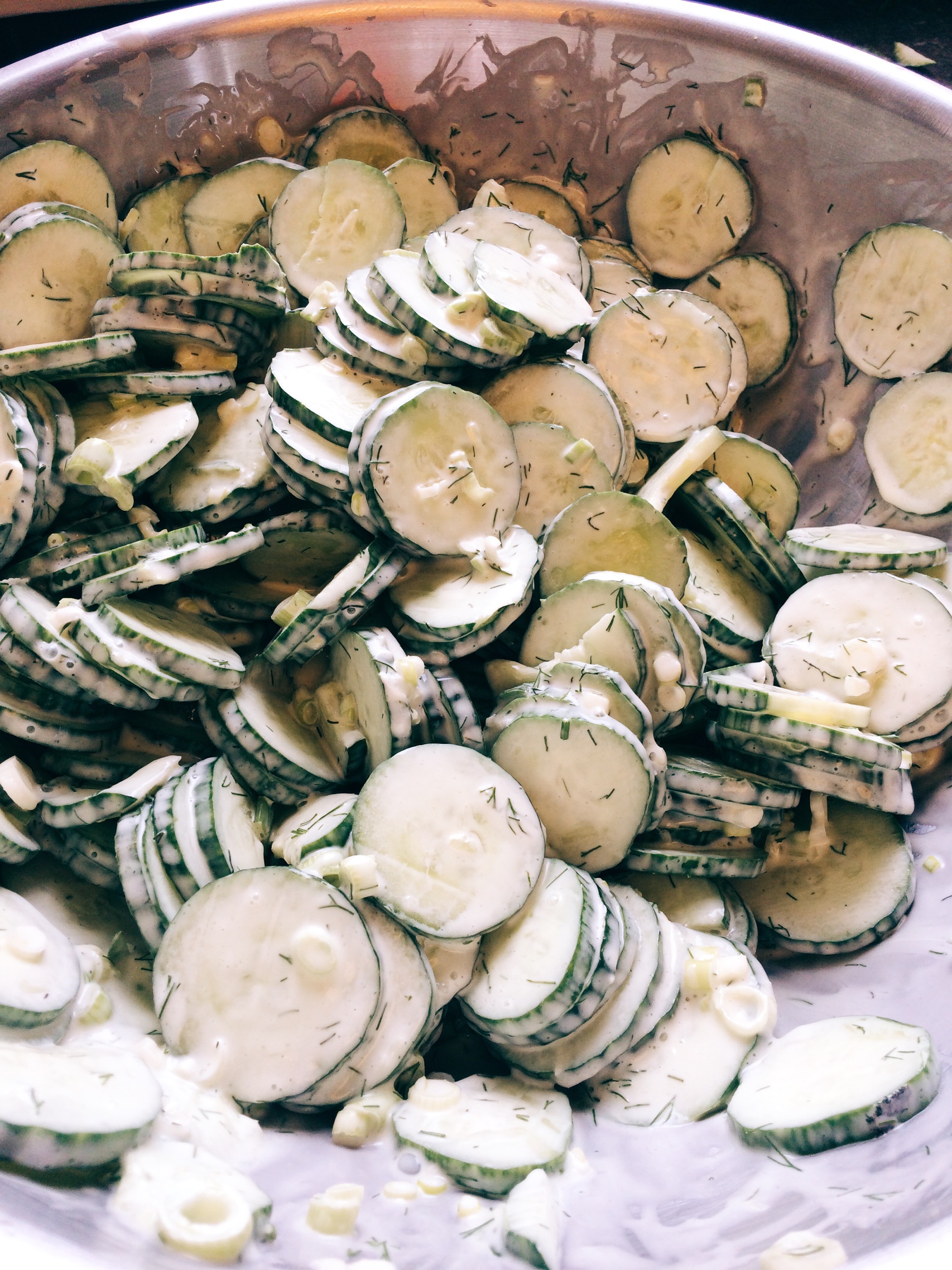 - cut cucumbers with a mandolin into thin slices and place in bowl
