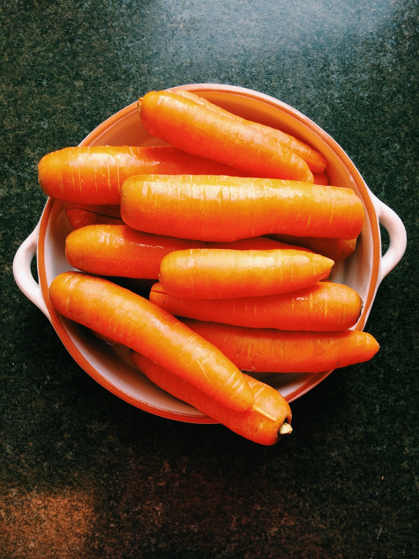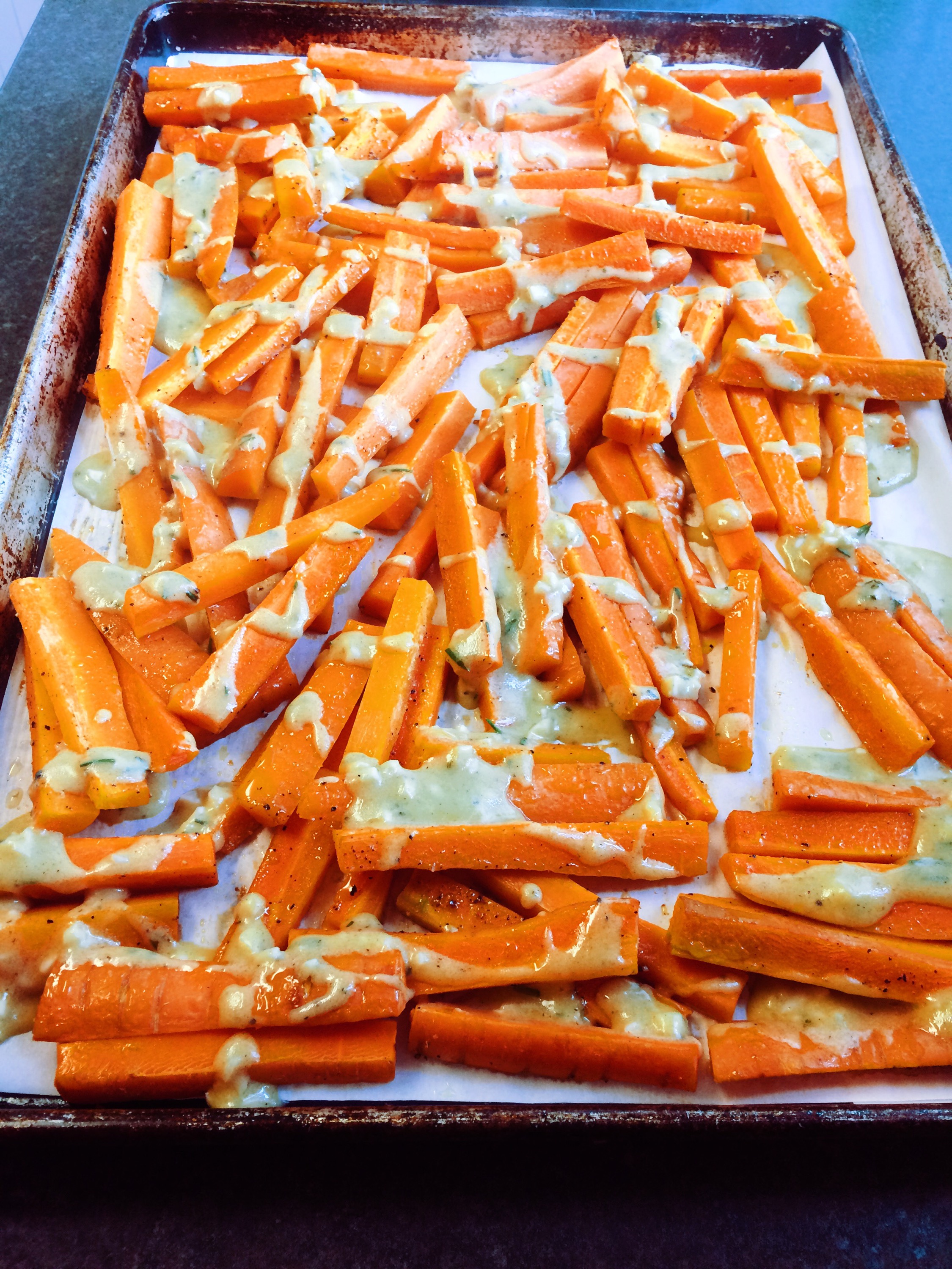 - cut carrots into sticks and place on a parchment lined baking sheet
