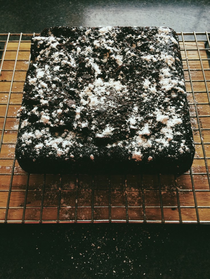 these brownies are so easy to make and moist and delish… the reason I sprinkled them with icing sugar is because I forgot to put parchment paper in the baking pan and half the cake stuck in the bottom of the pan and it was a bit of a disaster… so icing sugar covers all wrongs…