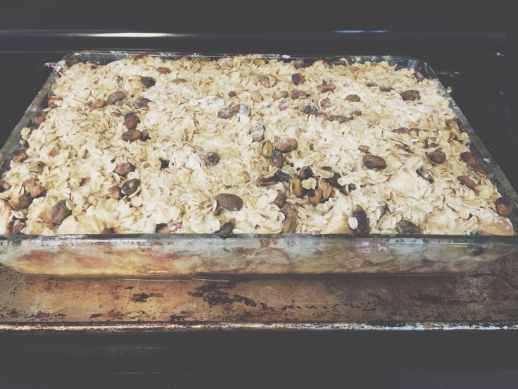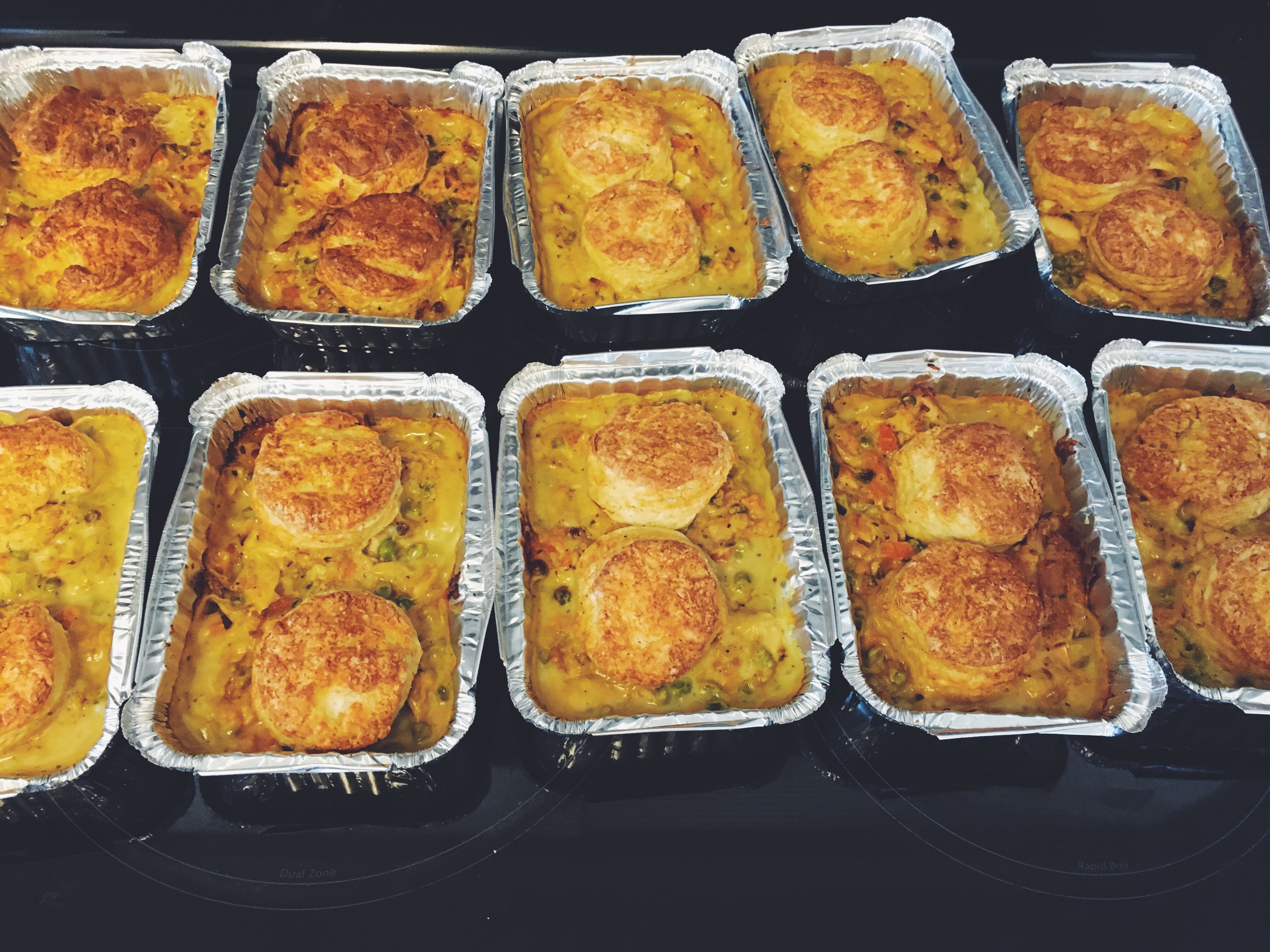 - in two 9×13 inch greased baking pans, spread out pot pie mixture
