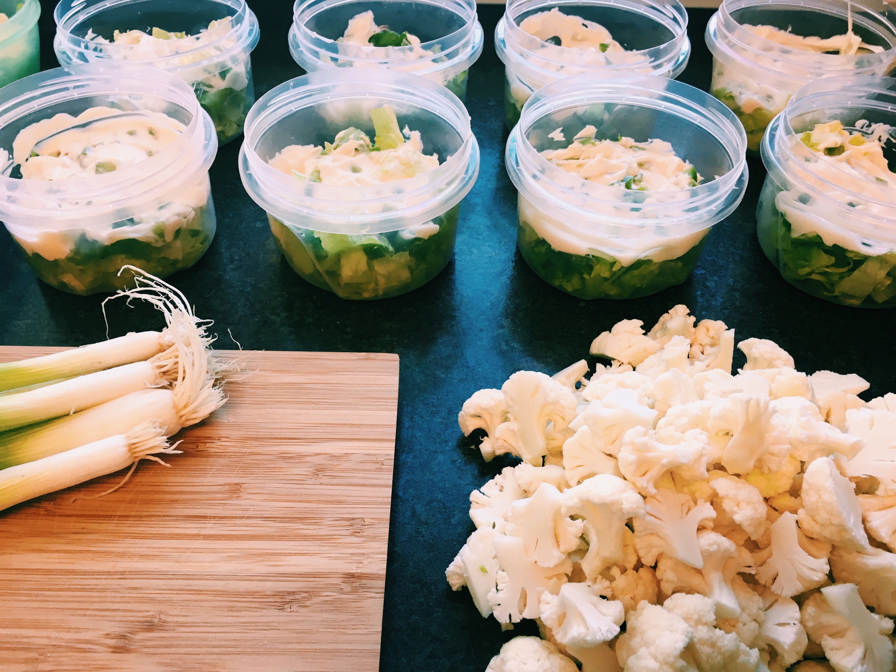 - in either a large bowl or in individual containers, place lettuce and green peppers