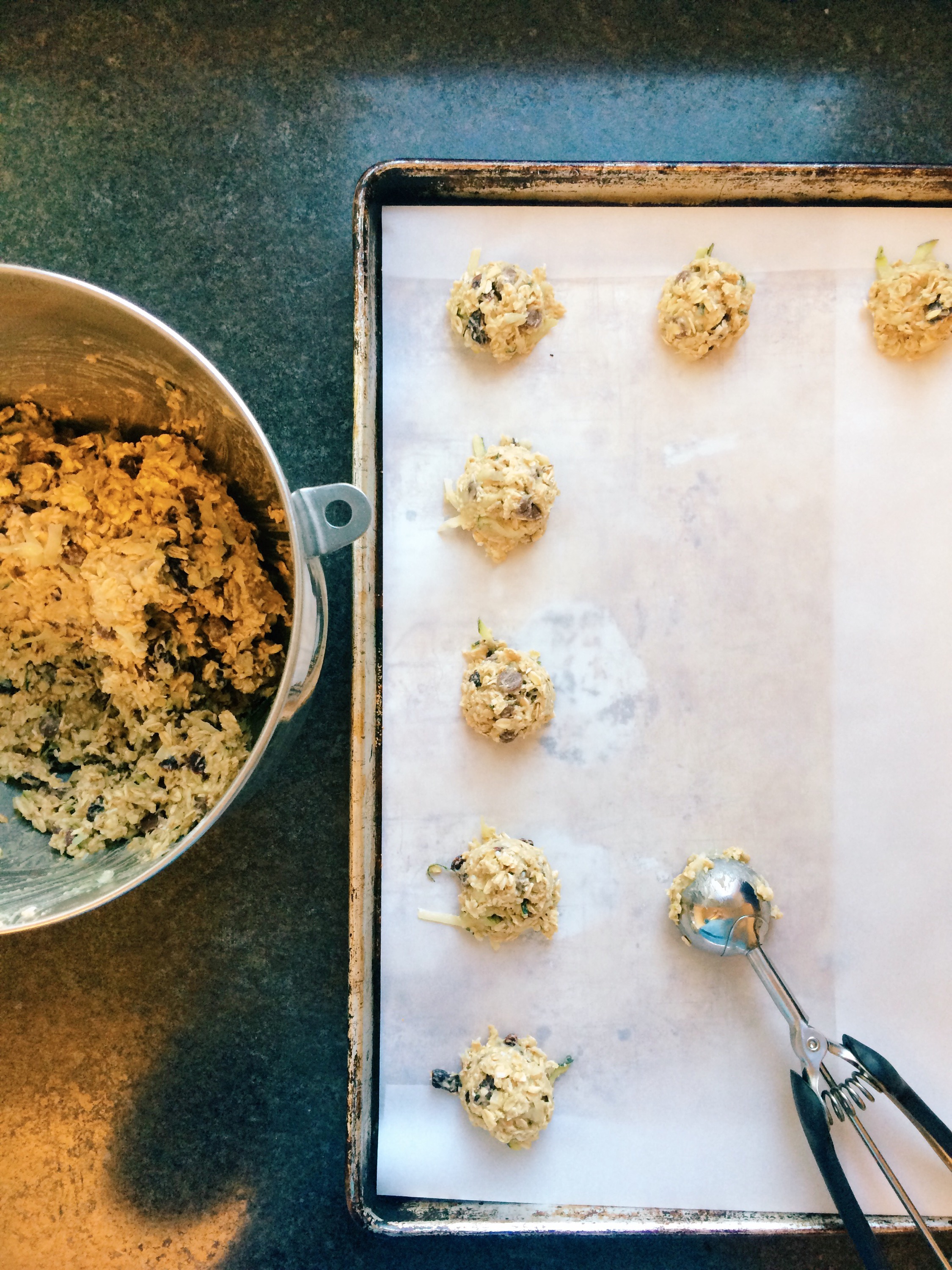- using a medium ice cream scoop, scoop out cookies onto a parchment lined baking sheet