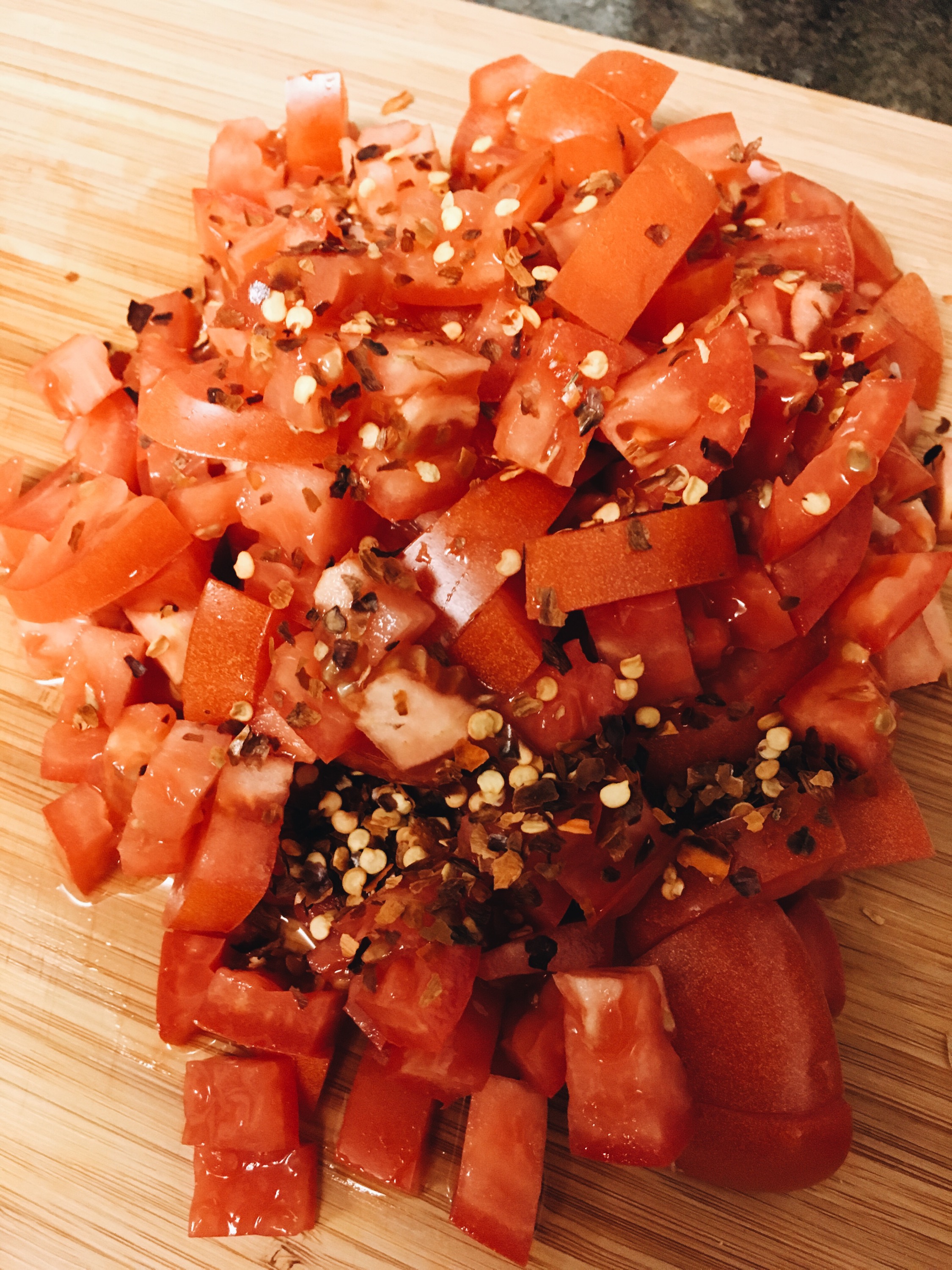 - add tomatoes, red pepper flakes, and more salt and pepper, cook for 10 minutes