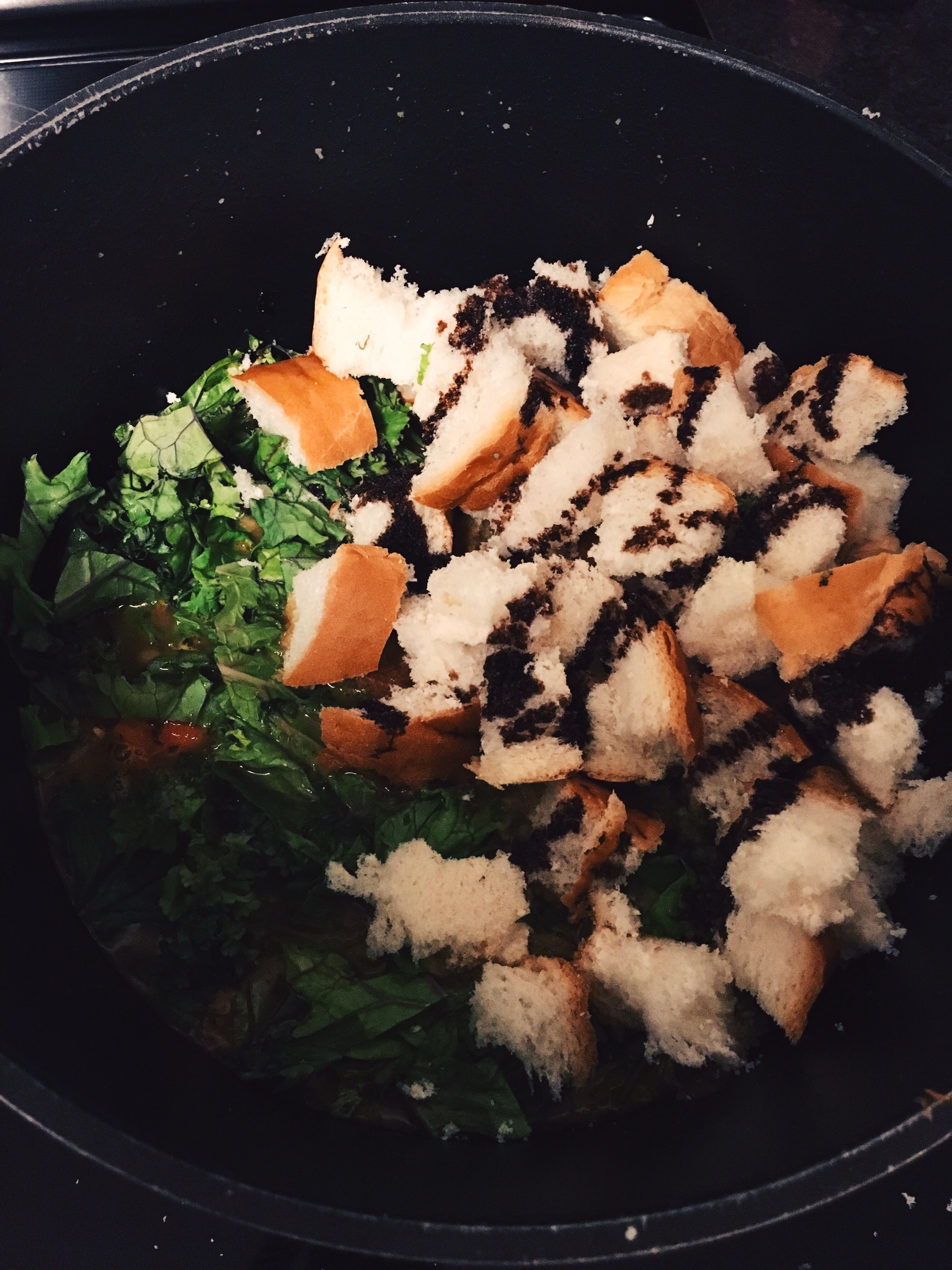 - add kale, cubed bread and drizzle with balsamic vinegar