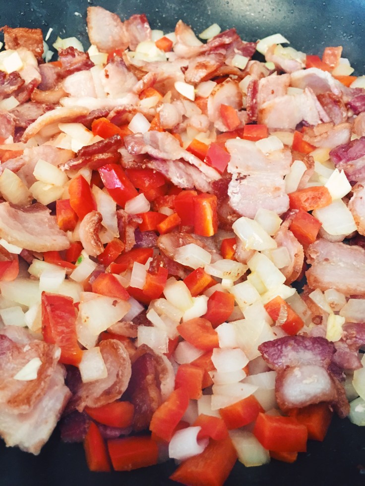 - drain some of the bacon fat, not all of it, and add onion, pepper and garlic and cook until they are soft
