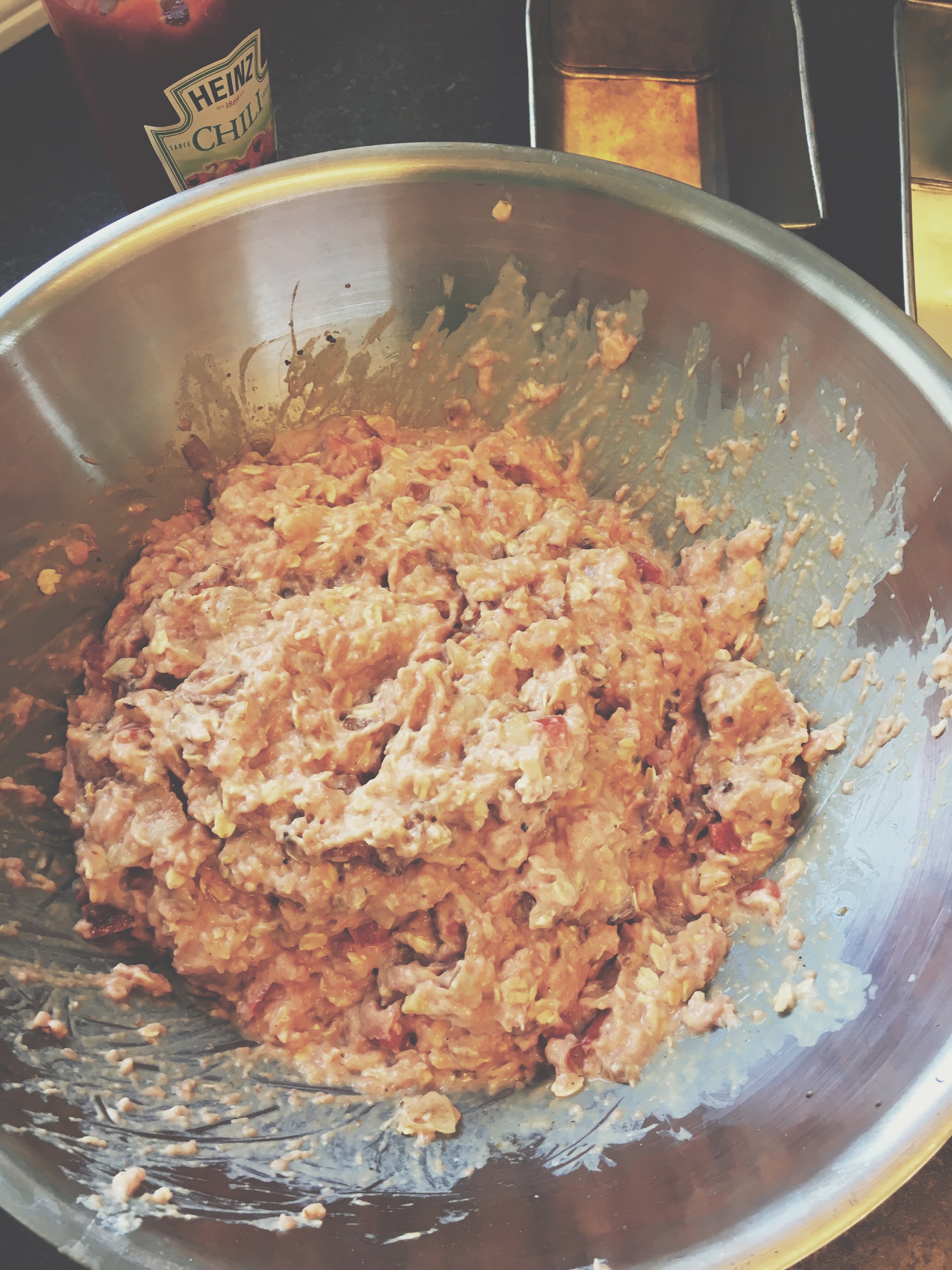 - in a large bowl, combine oats, evaporated milk, ground turkey, 1 tsp salt, ground pepper and 1/4 cup chili sauce