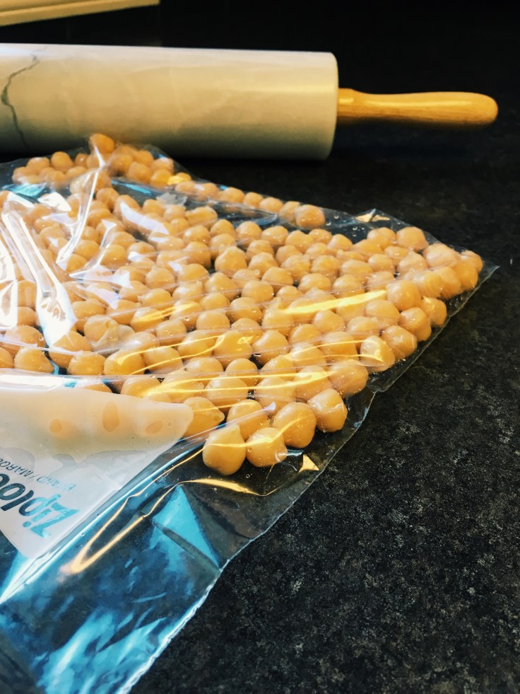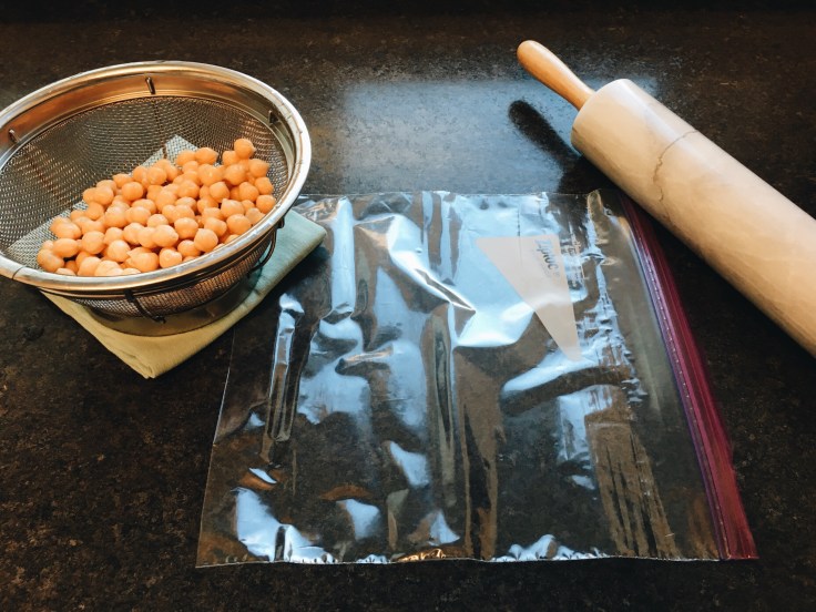 • rinse the chickpeas, then place in a large ziplock bag and seal without the air in in