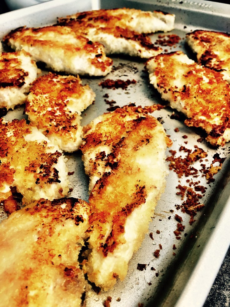 - 5 boneless, skinless chicken breasts, sliced into 3 pieces each and flattened