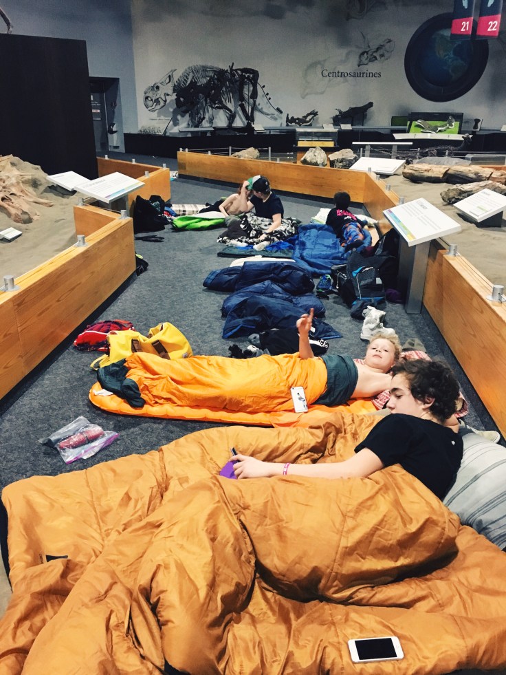 The kids had all set up their sleeping areas, with the girls camped around the T-Rex and I was in charge of the boys who were nestled under some sort of Therapod. I did notice some of the children actually brought blow up air mattresses, or cots, or actually memory foam mattresses.