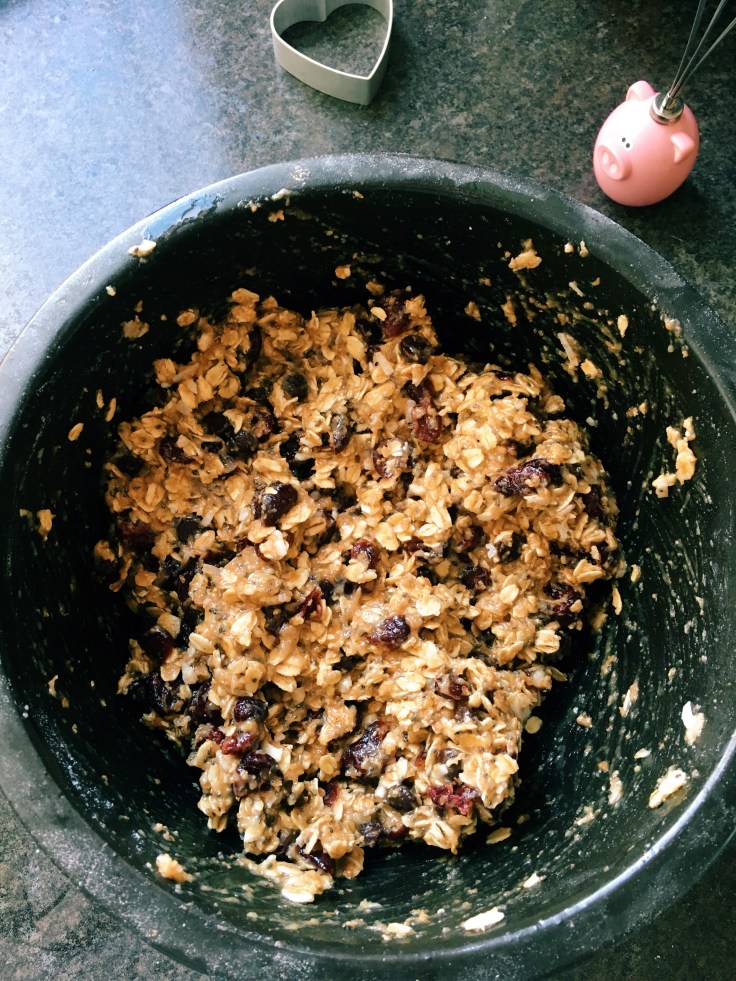 - fold in cranberries, chocolate chips and coconut