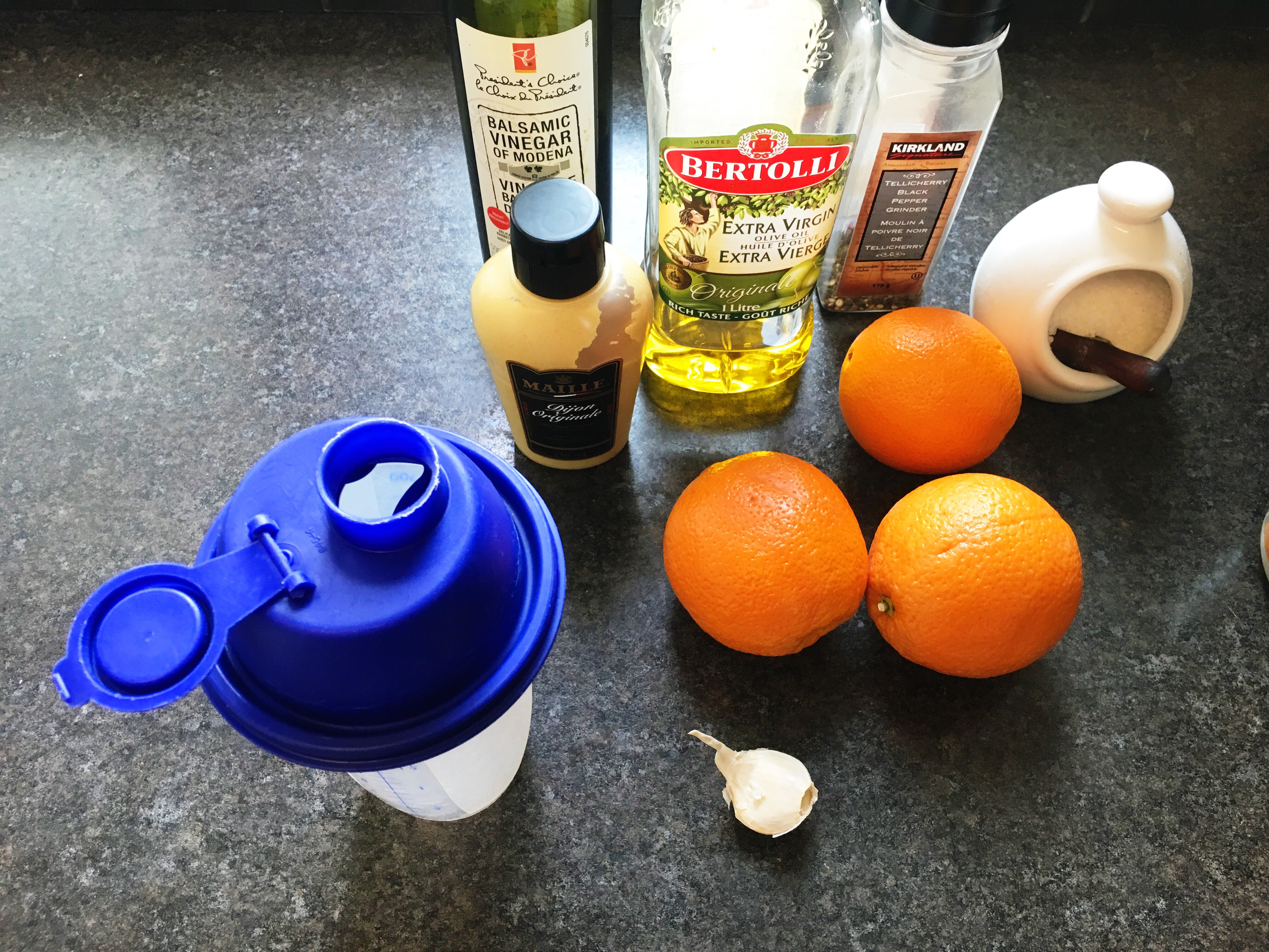 - in a salad shaker, combine ingredients except for the garlic and shake until well mixed