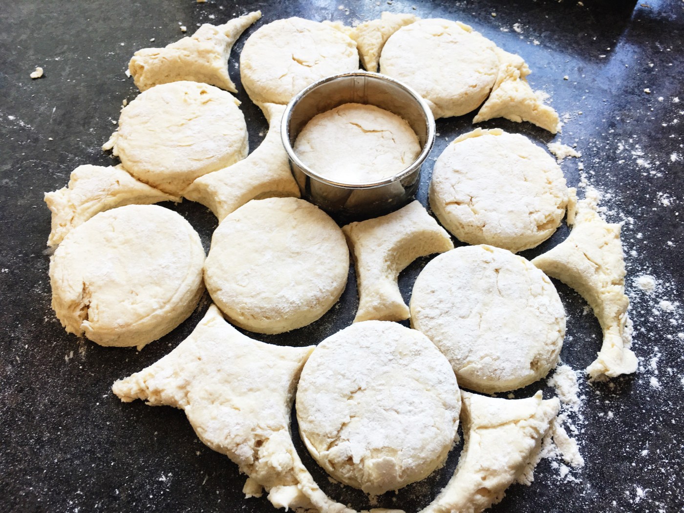 - dip a 2.5 inch biscuit cutter in flour and cut out the biscuits
