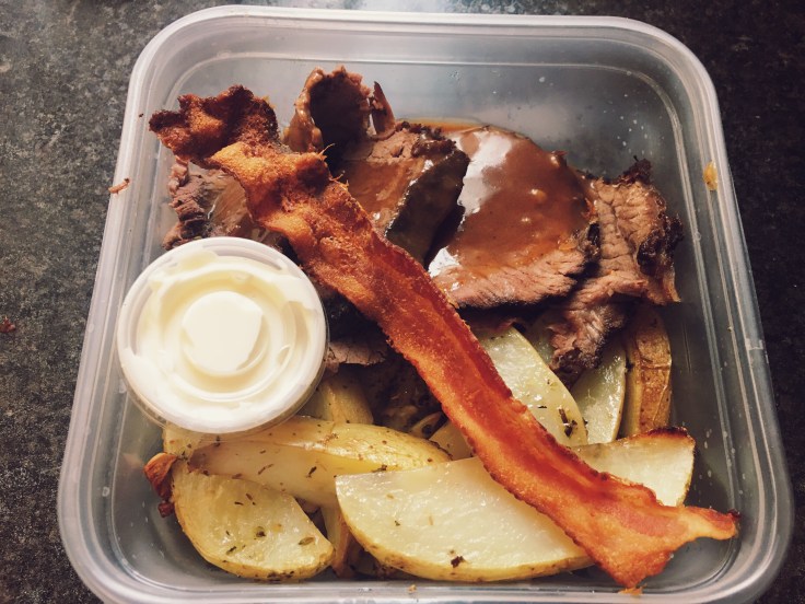 Brandon, my 14 year old who lost all brain function about 3 months ago, actually suggested the sour cream on the side to go along with the roast, potatoes and burnt bacon… (but I learnt a lot of life lessons from the podcast I was engrossed in while the bacon was burning… so in the end I think a good thing)… I was proud of him… prouder than I have been in ages… months actually… I almost included him in the picture that was interrupting my podcast…