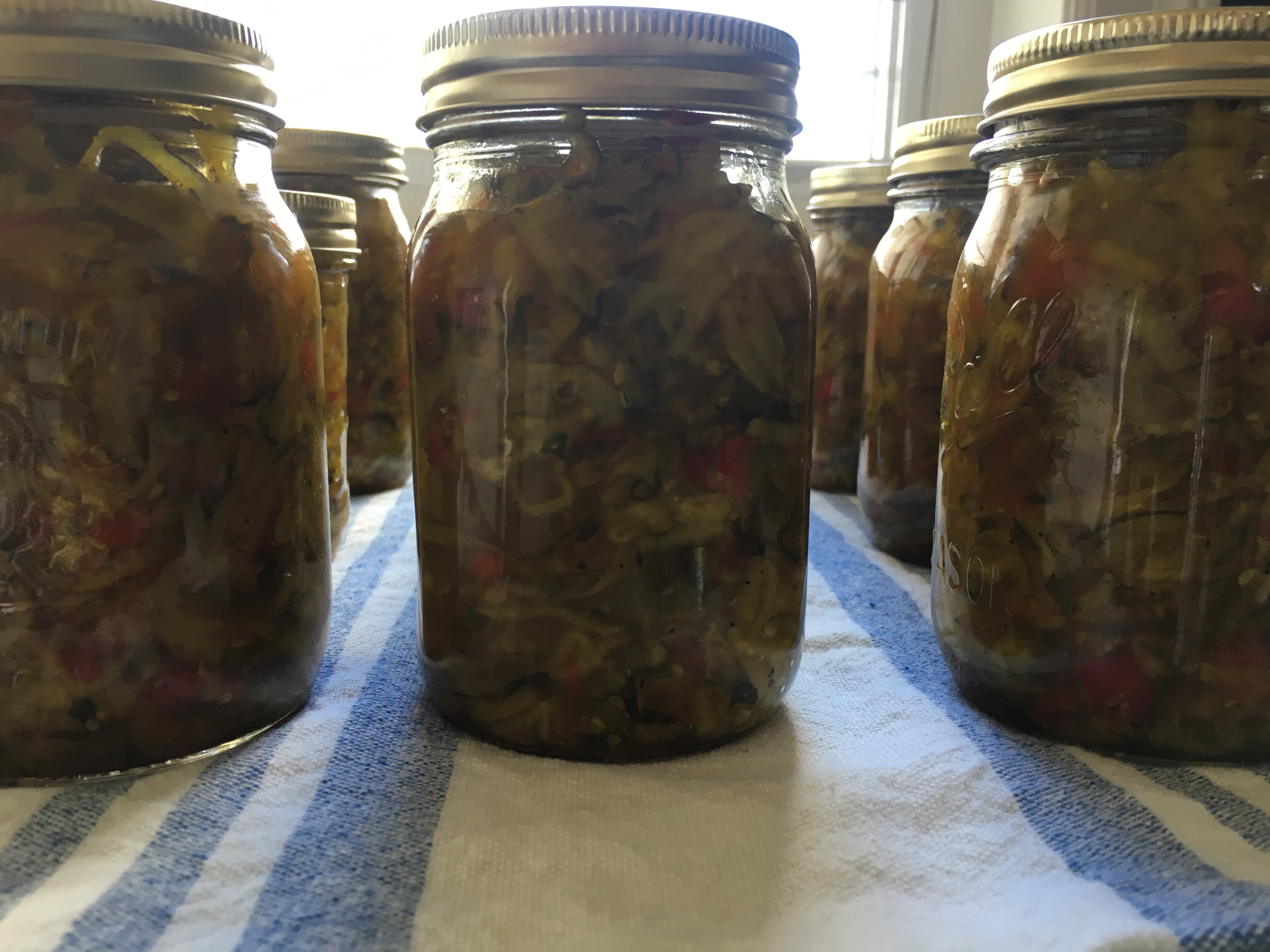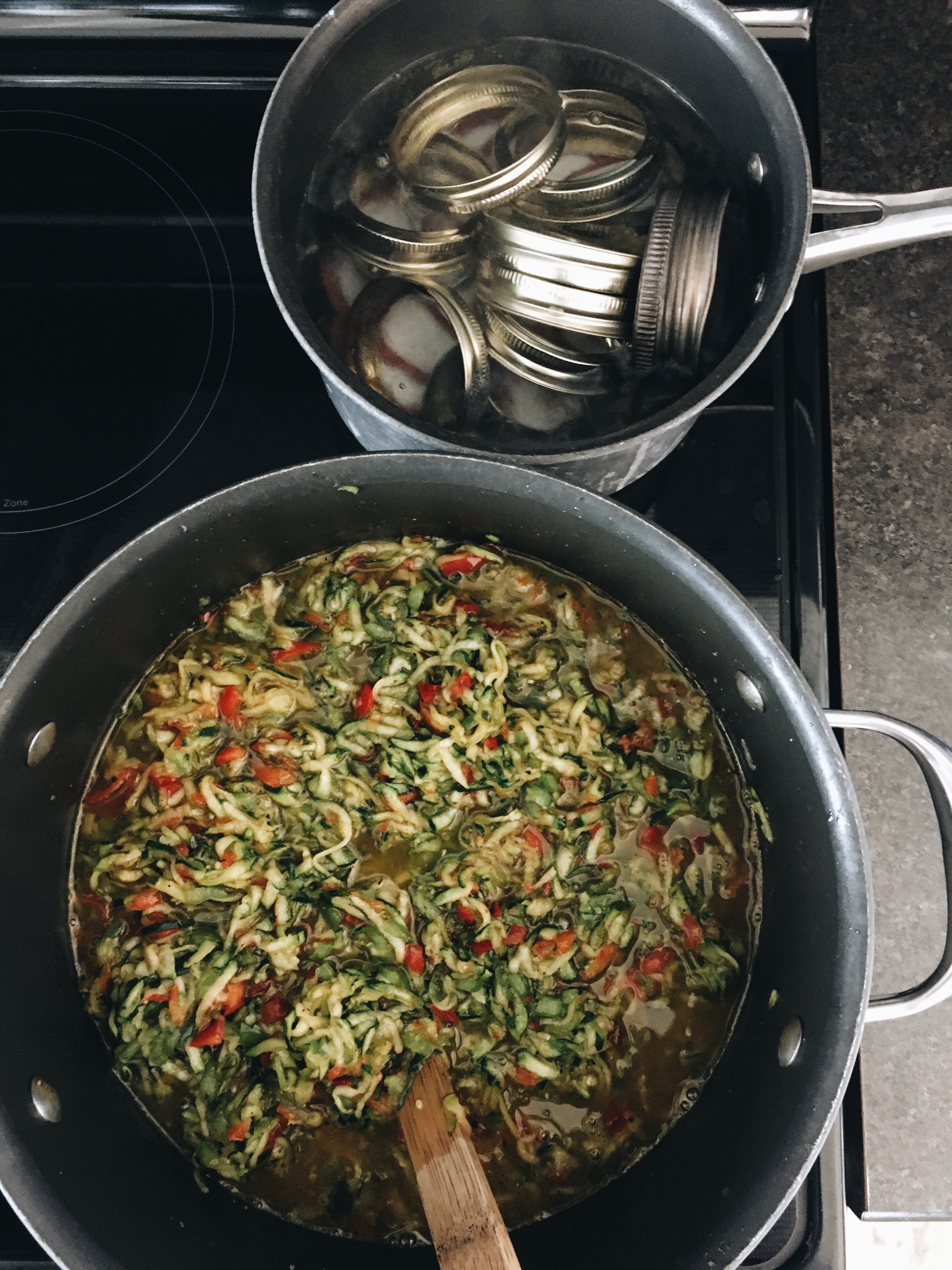 I take one jar out with a tea towel, then scoop the cooked zucchini pepper mixture into it until it is just about full… I clean the sides of if needed and then with tongs scoop out the lid and place it on the jar and screw it shut with a tea towel…