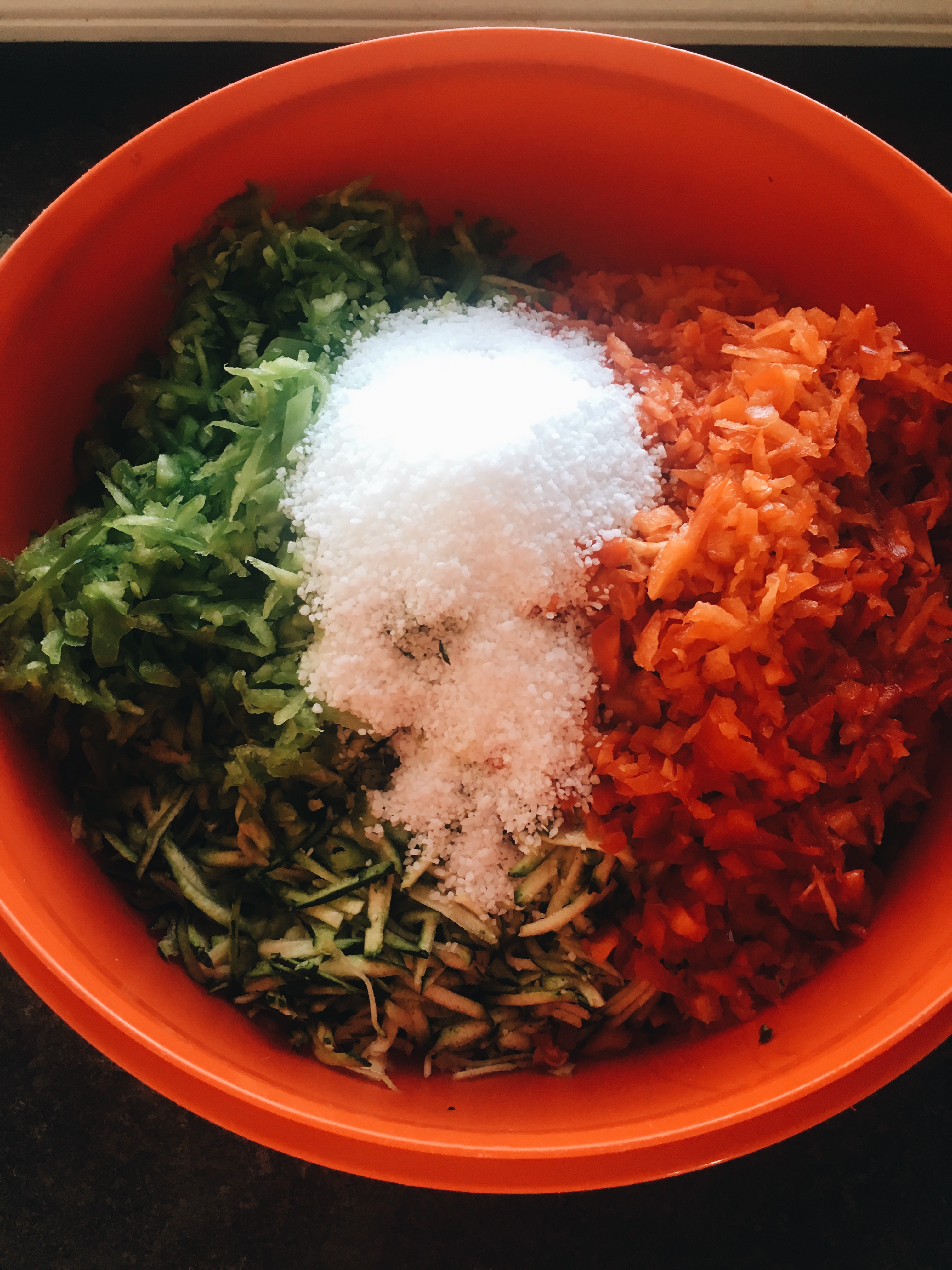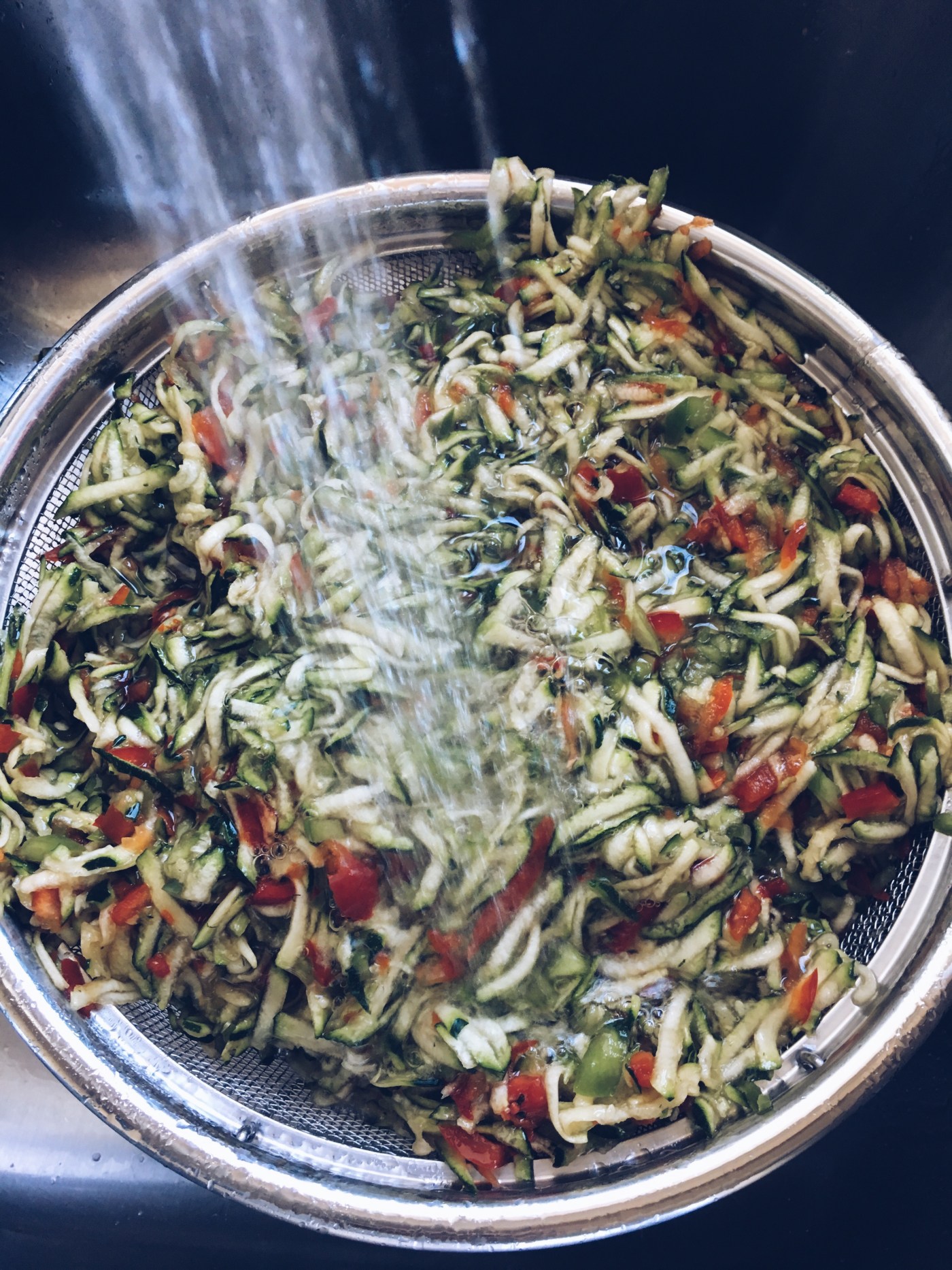 the process involves getting your ingredients grated, add the salt, stir and let stand overnight… I put mine in the fridge because it feels wrong to me for some reason to leave it out on my counter… but I believe you can leave it out on the counter… in fact the recipe tells you to…