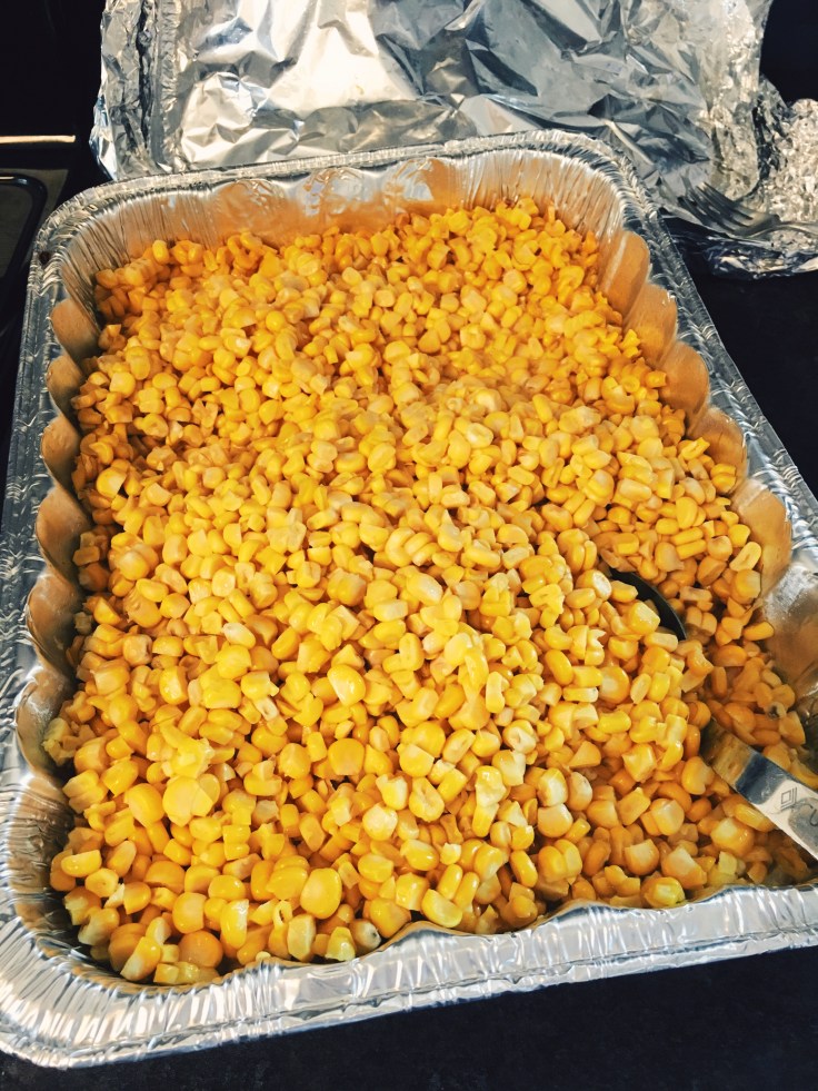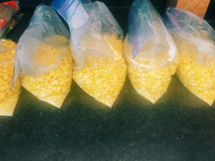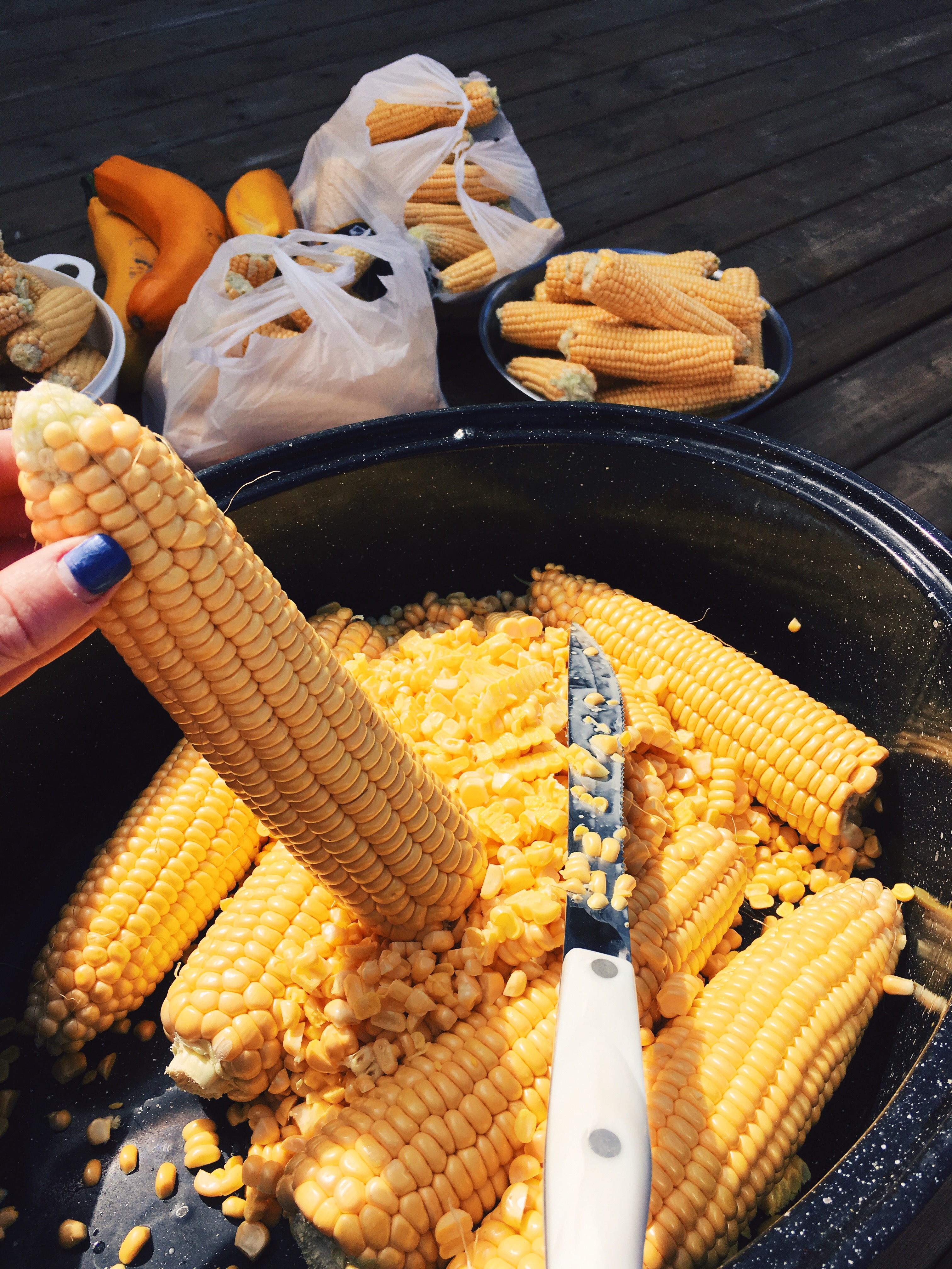 - @ 40 cobs corn, kernels cut off into a bowl to use