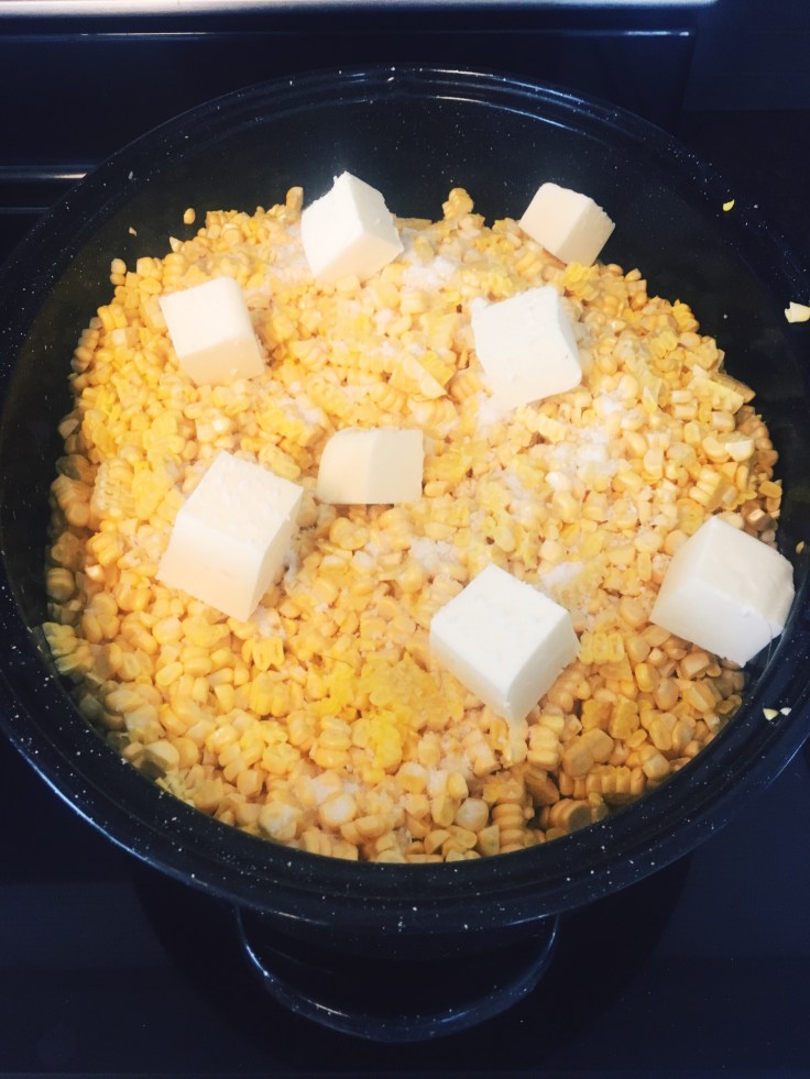 - put kernels in a large roasting pan, add butter, cream, salt and sugar