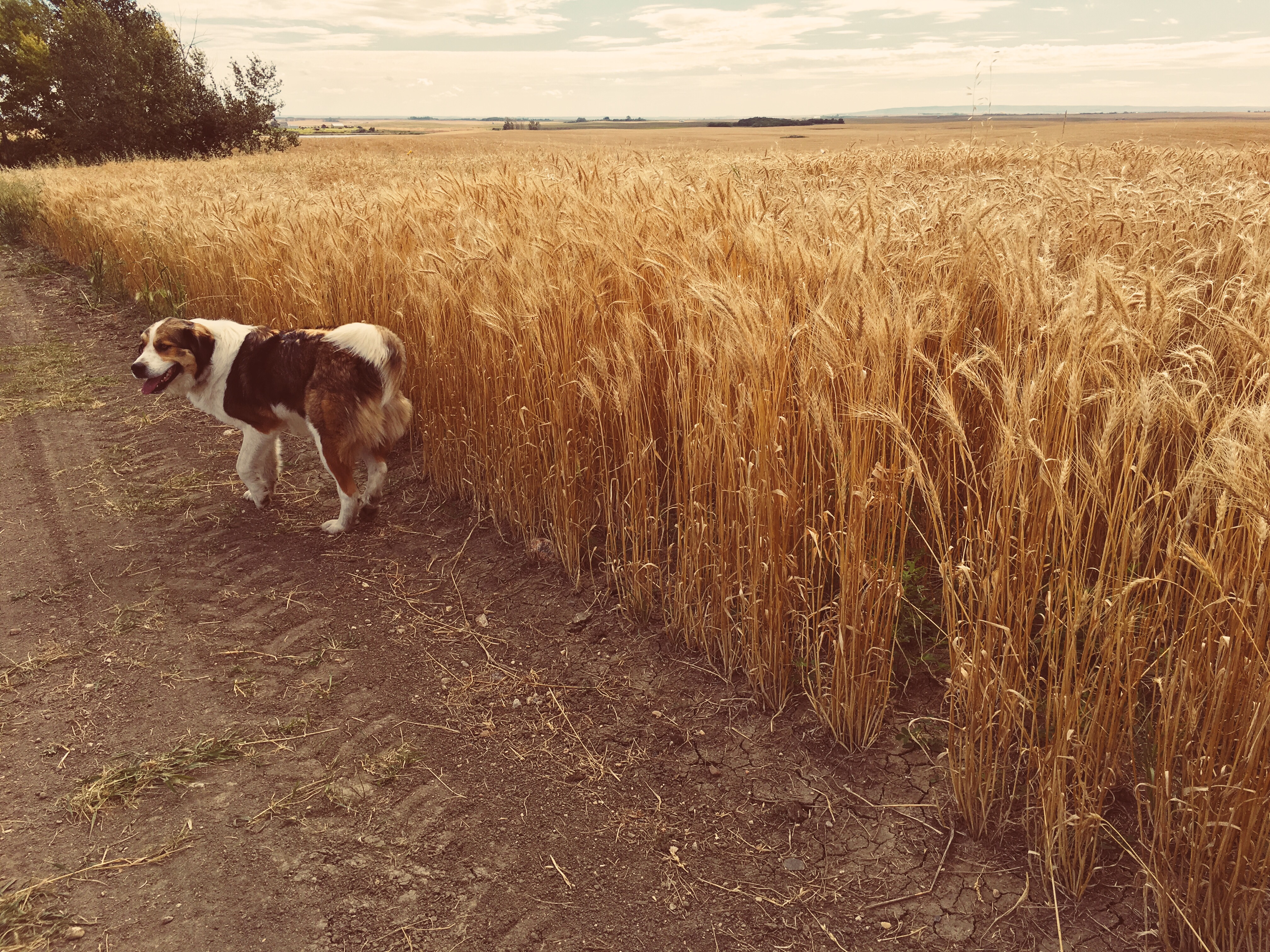 I have to stick to the dirt roads as there is an abnormal amount of heavy machinery traffic on the grid roads… and this lovely dog Lacy tends to stand in the middle of road when a sprayer or combine or grain truck comes rolling by…