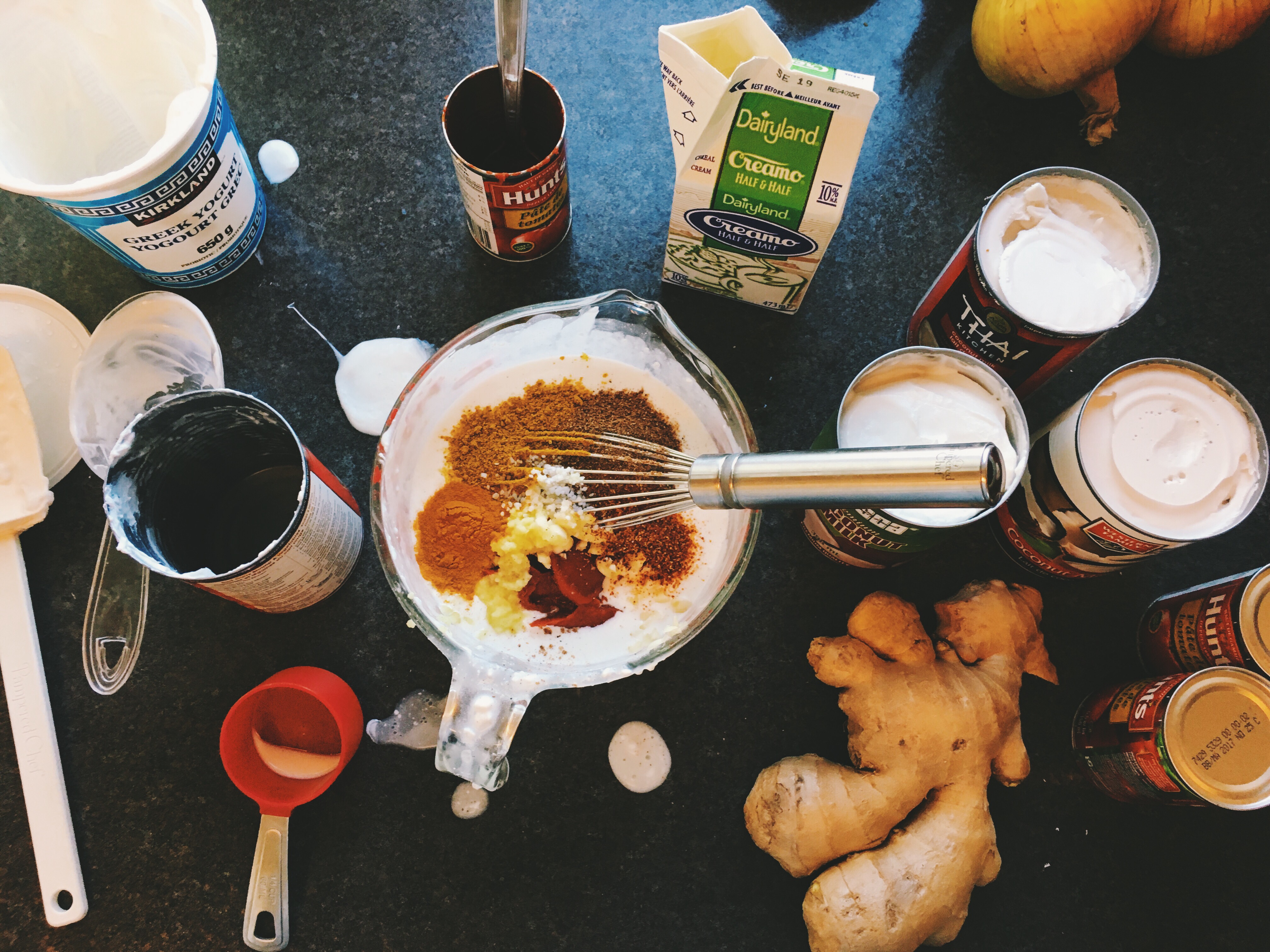 - in a large measuring bowl, mix together coconut milk, greek yogurt and cream