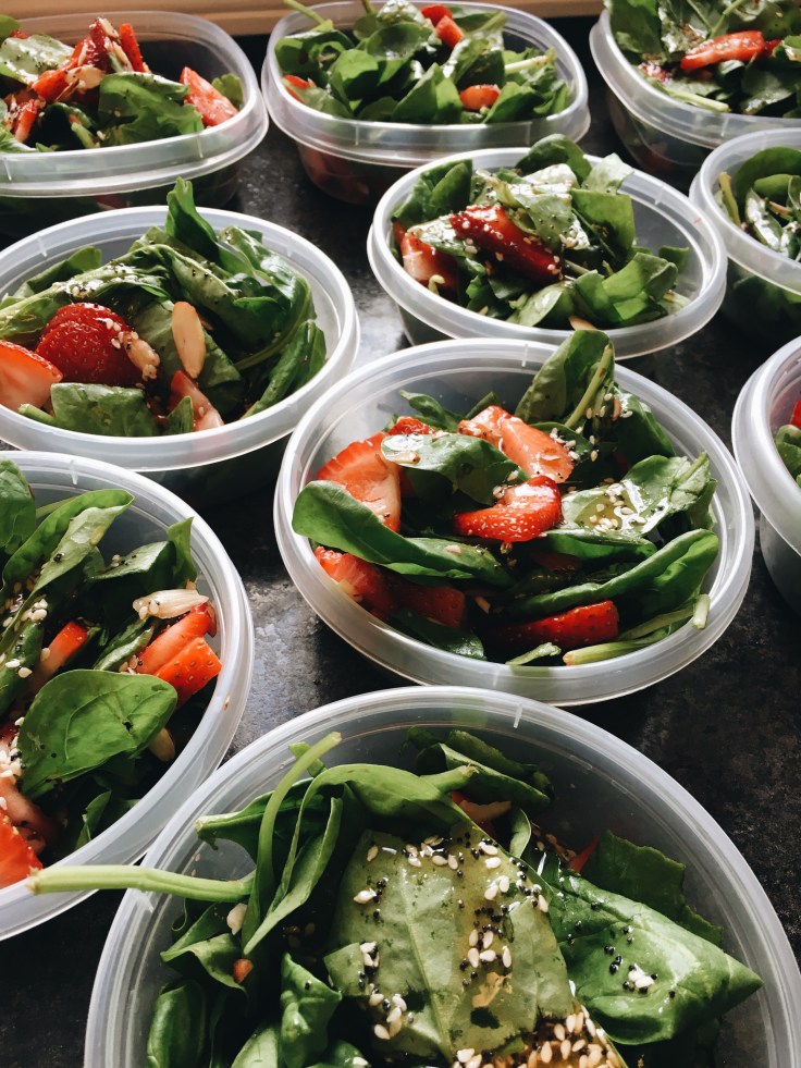 - place spinach (if too much take some out) and strawberries and almonds in a very large bowl