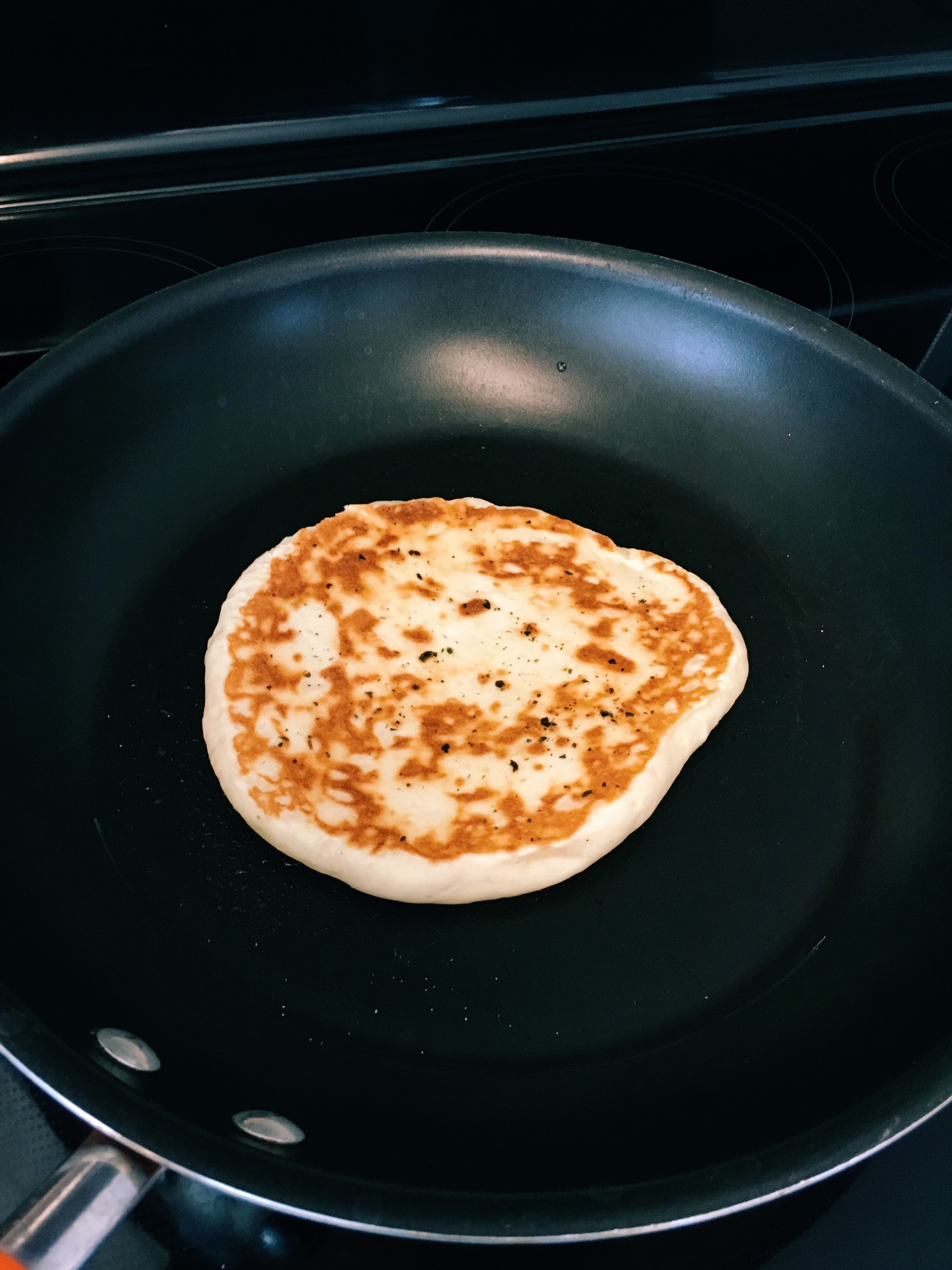– brush the dough with butter and place in a frying pan on med/high heat and cover with a lid for 1 minute or until you see bubbles begin to form