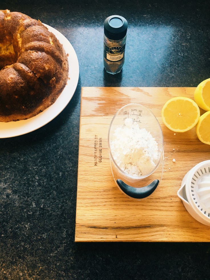 - whisk the powdered sugar, lemon juice and cardamom together and drizzle over cake and serve