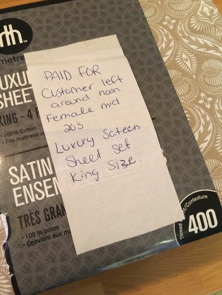 and she asked me if these were the sheets… I read the note, almost teared up I was so happy to see the description of me in my mid-20’s… and claimed the sheets…