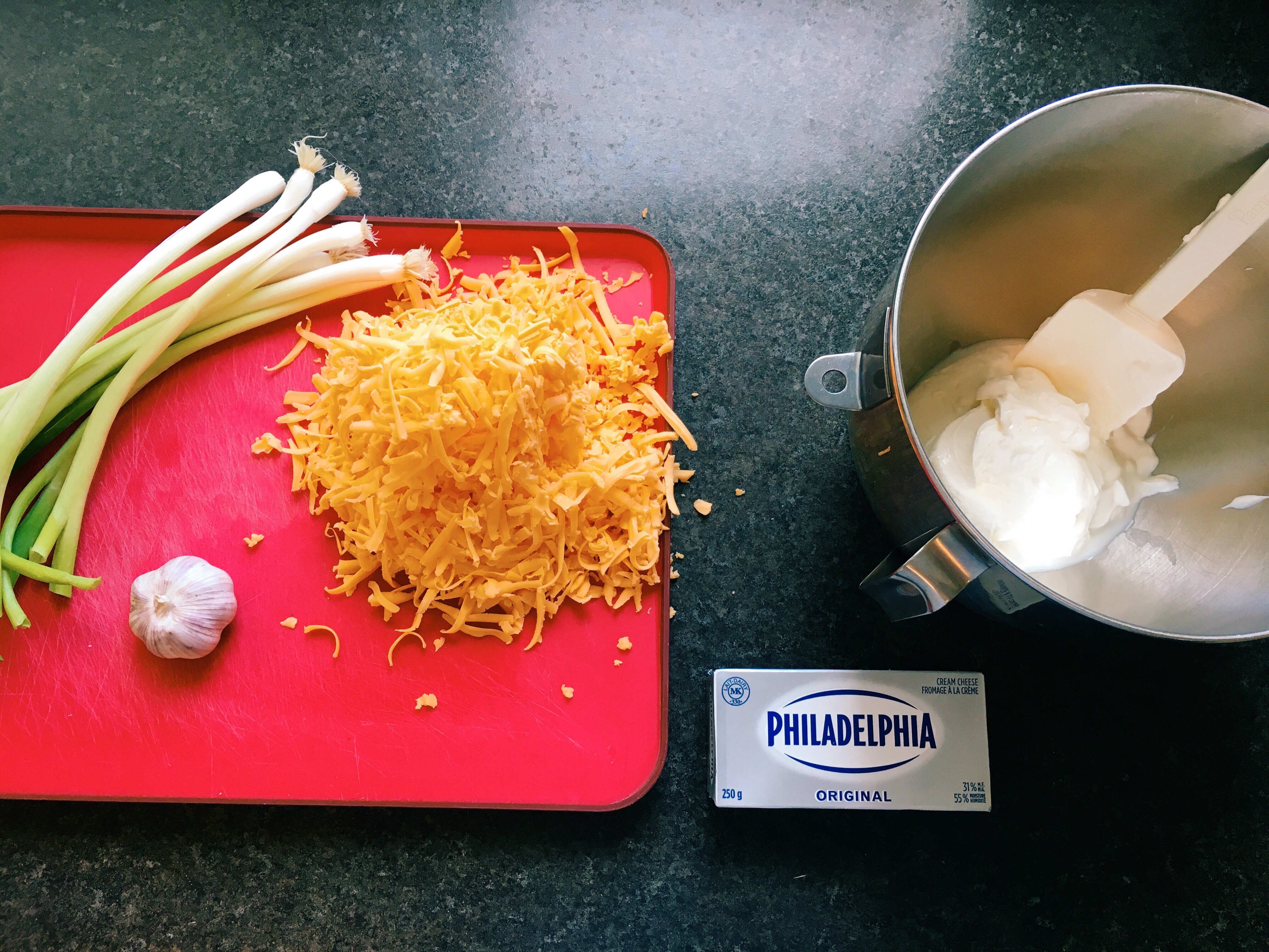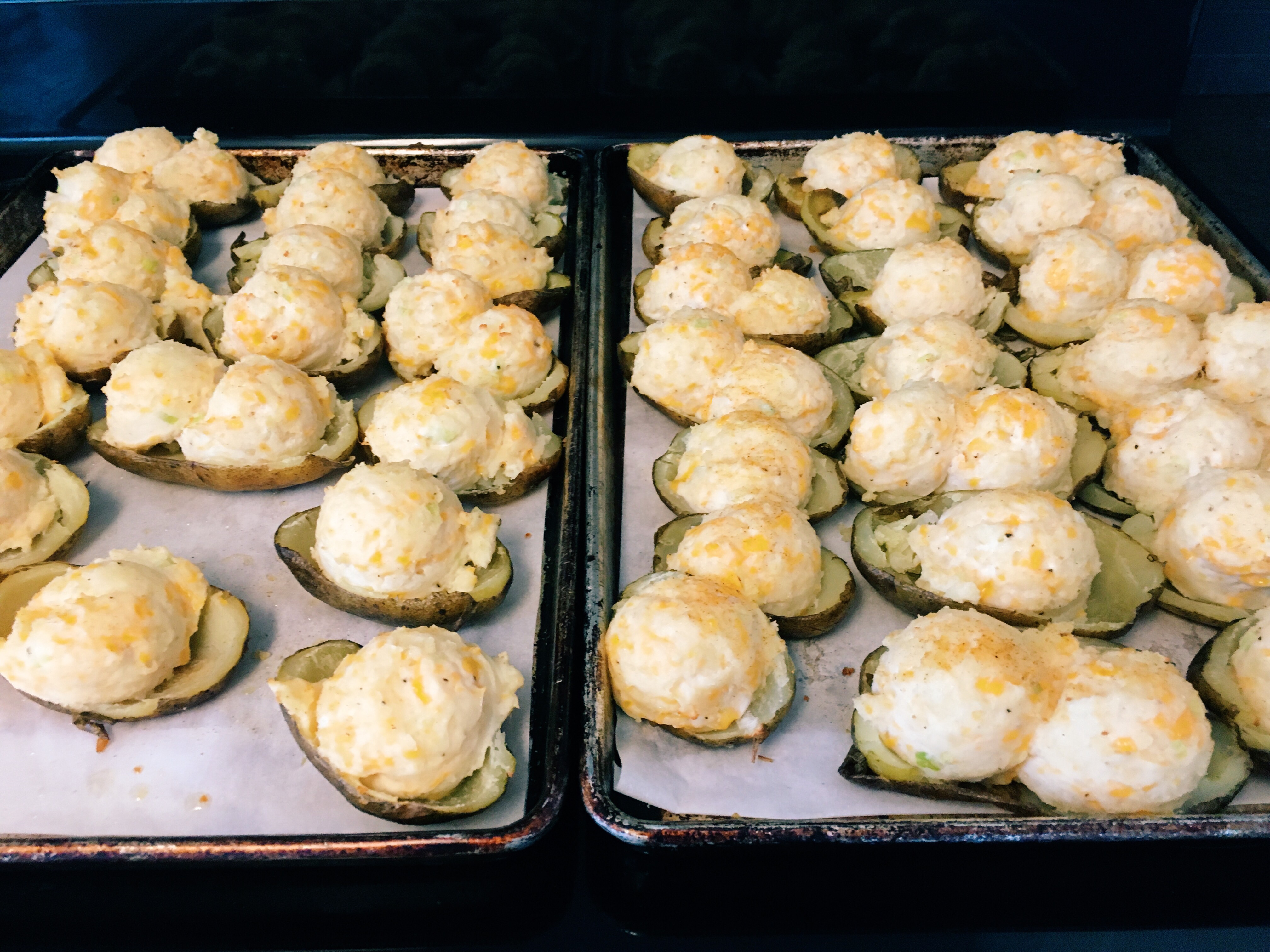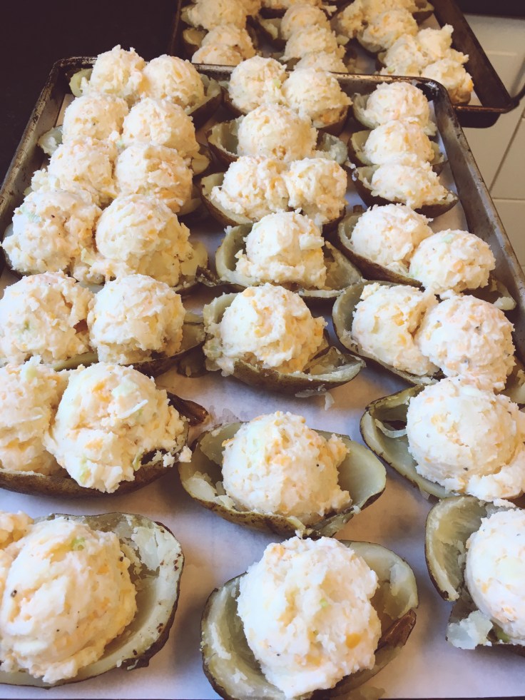 - cut each potato in half and using an ice cream scoop, scoop out inside to a mixing bowl