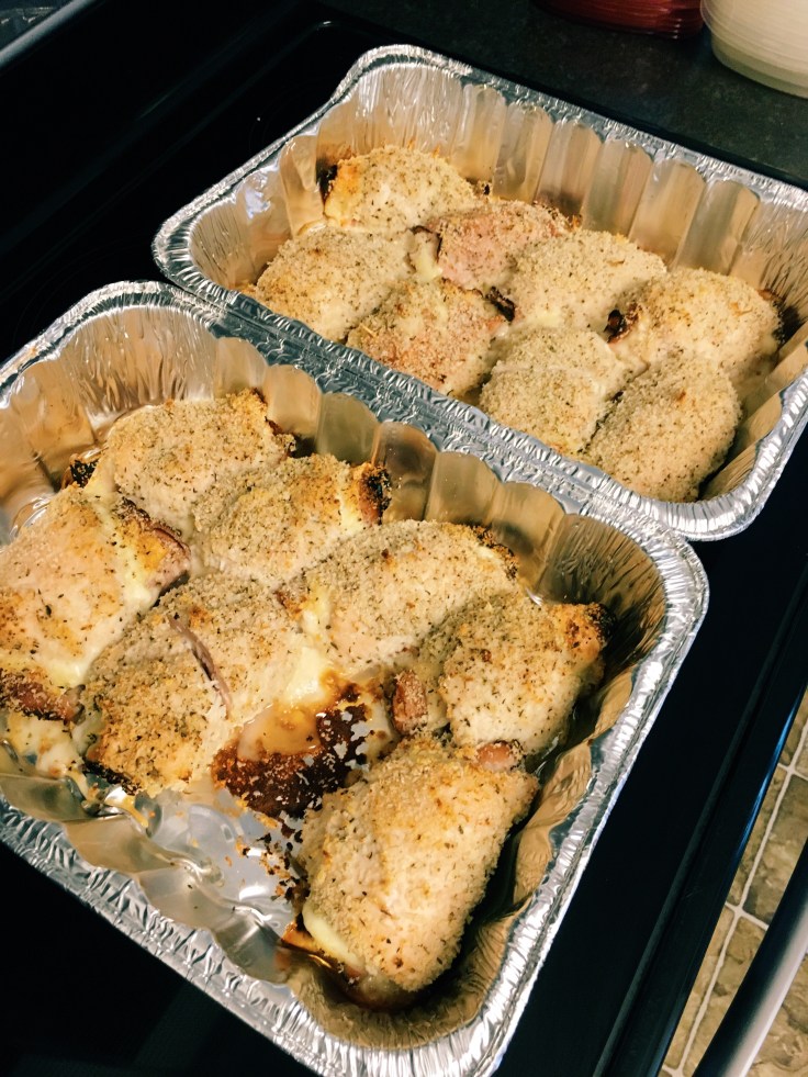 here is the chicken cordon bleu ‘roll-ups’ I had made earlier and could just pop in the oven… I did put a note with each supper saying ‘remove the toothpicks from the chicken’… I was thinking of one of them driving a combine and picking up a piece of chicken and stabbing the roof of their mouth with a toothpick I had used to keep the chicken, ham and swiss cheese all rolled up…