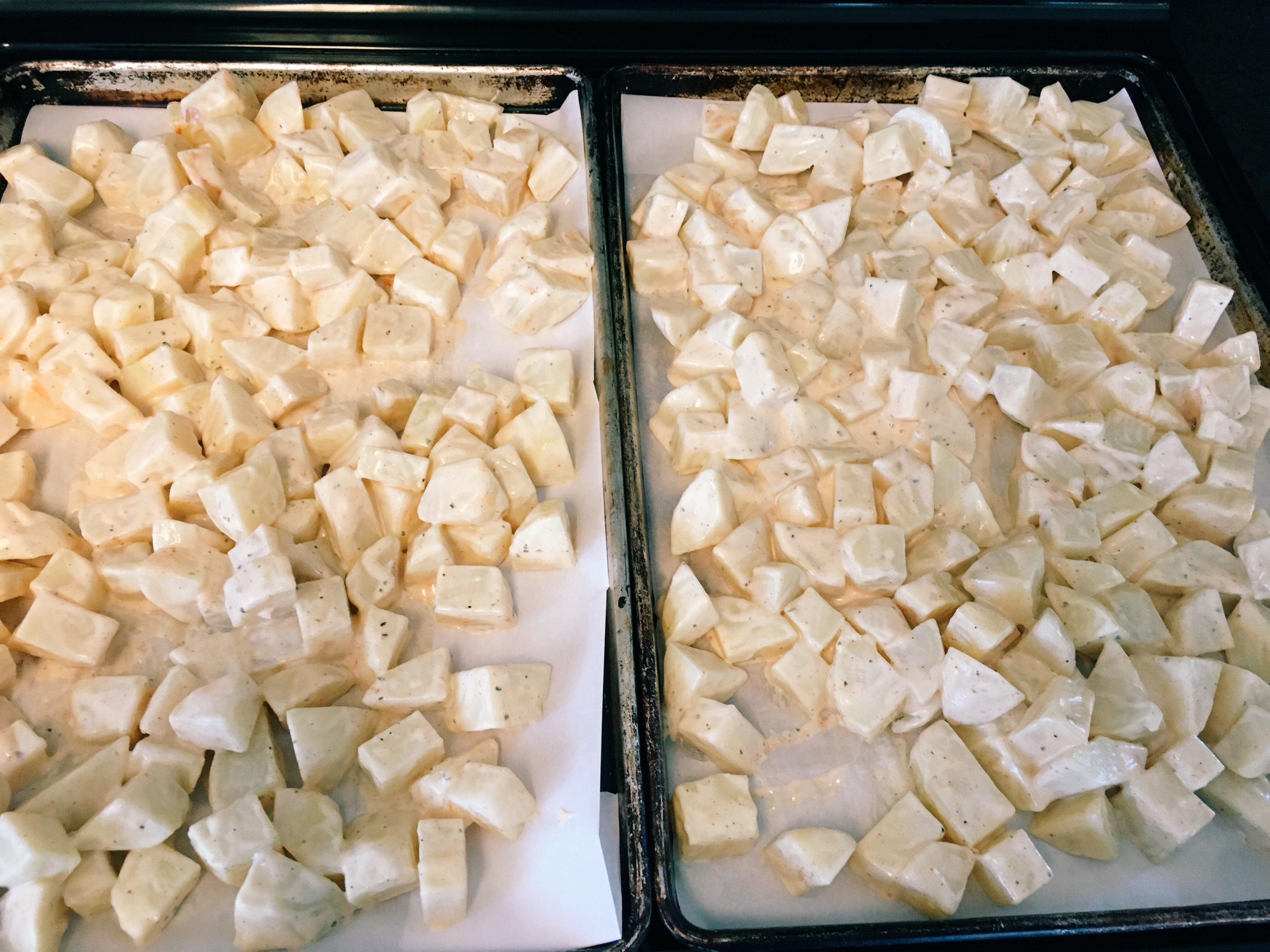 - pour potato mixture onto parchment lined baking sheet