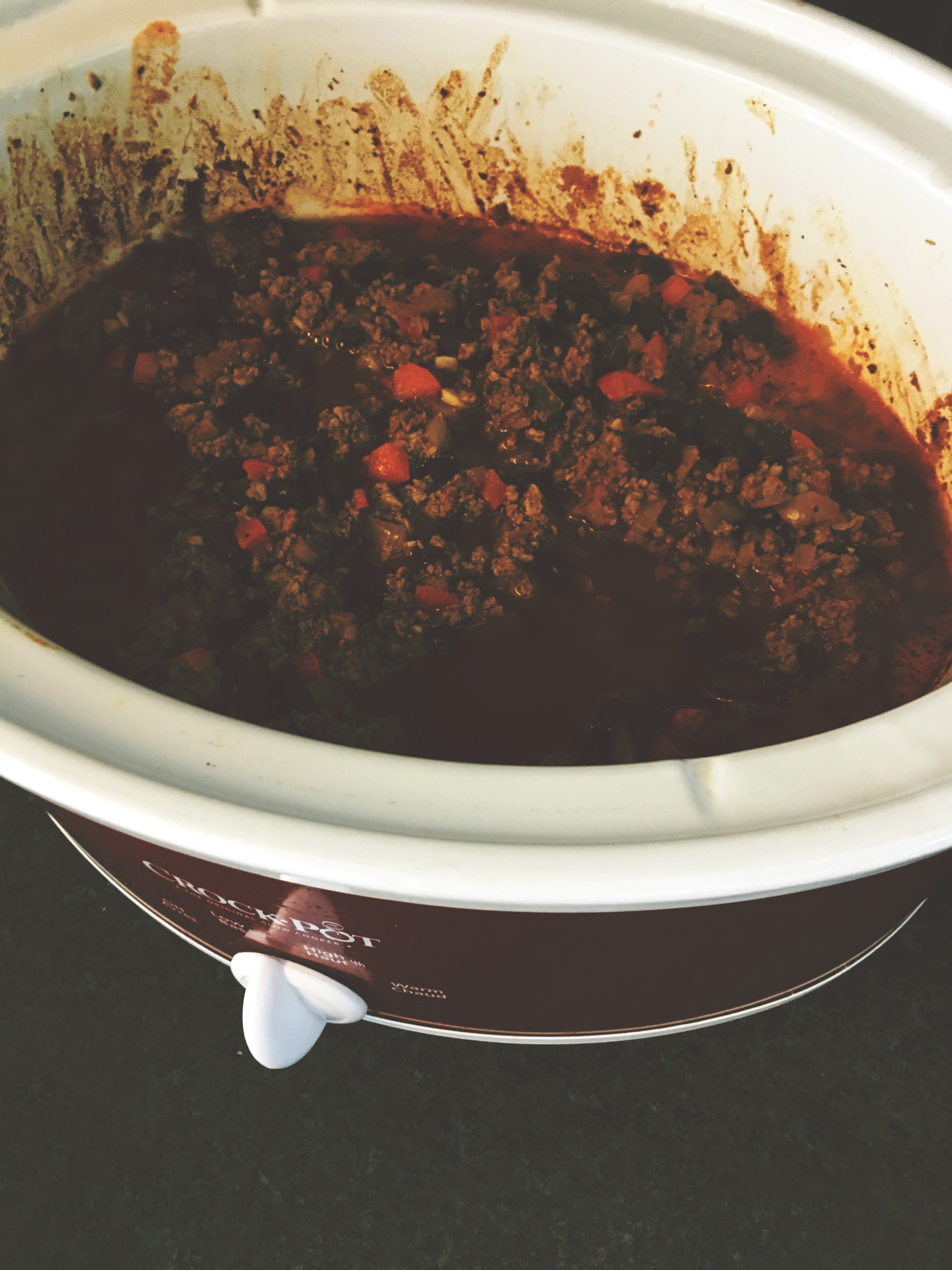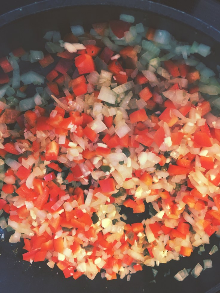 – soften the onions, garlic, red pepper and jalapeno in the olive oil and then transfer to crock pot