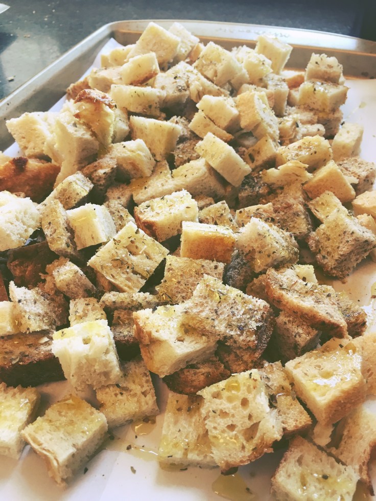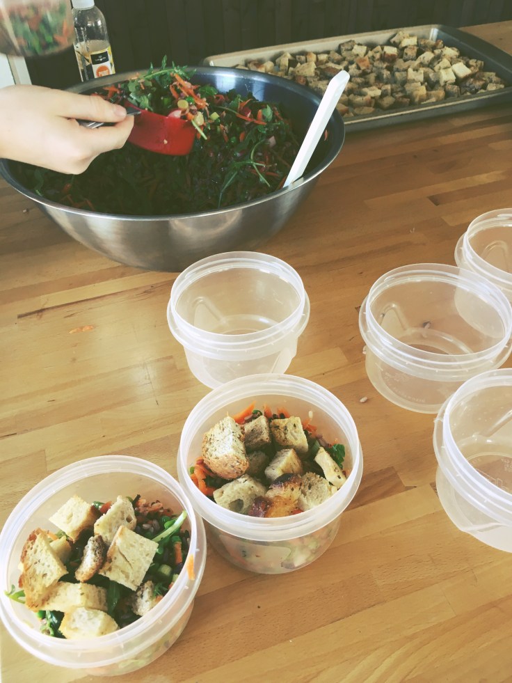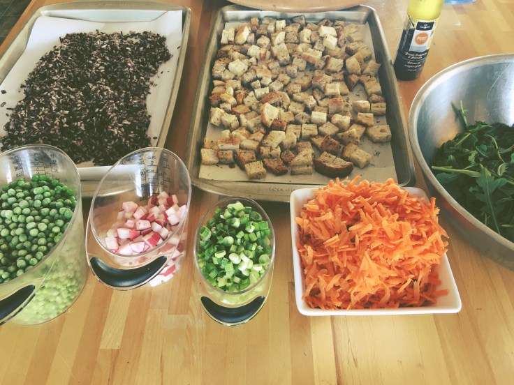 this wild rice salad I thought was delicious but was worried might look a little too healthy for the farmers so I threw some homemade croutons on top… well, my 13 year old son did… that is him packing up the salads… I was probably busy watching Netflix…