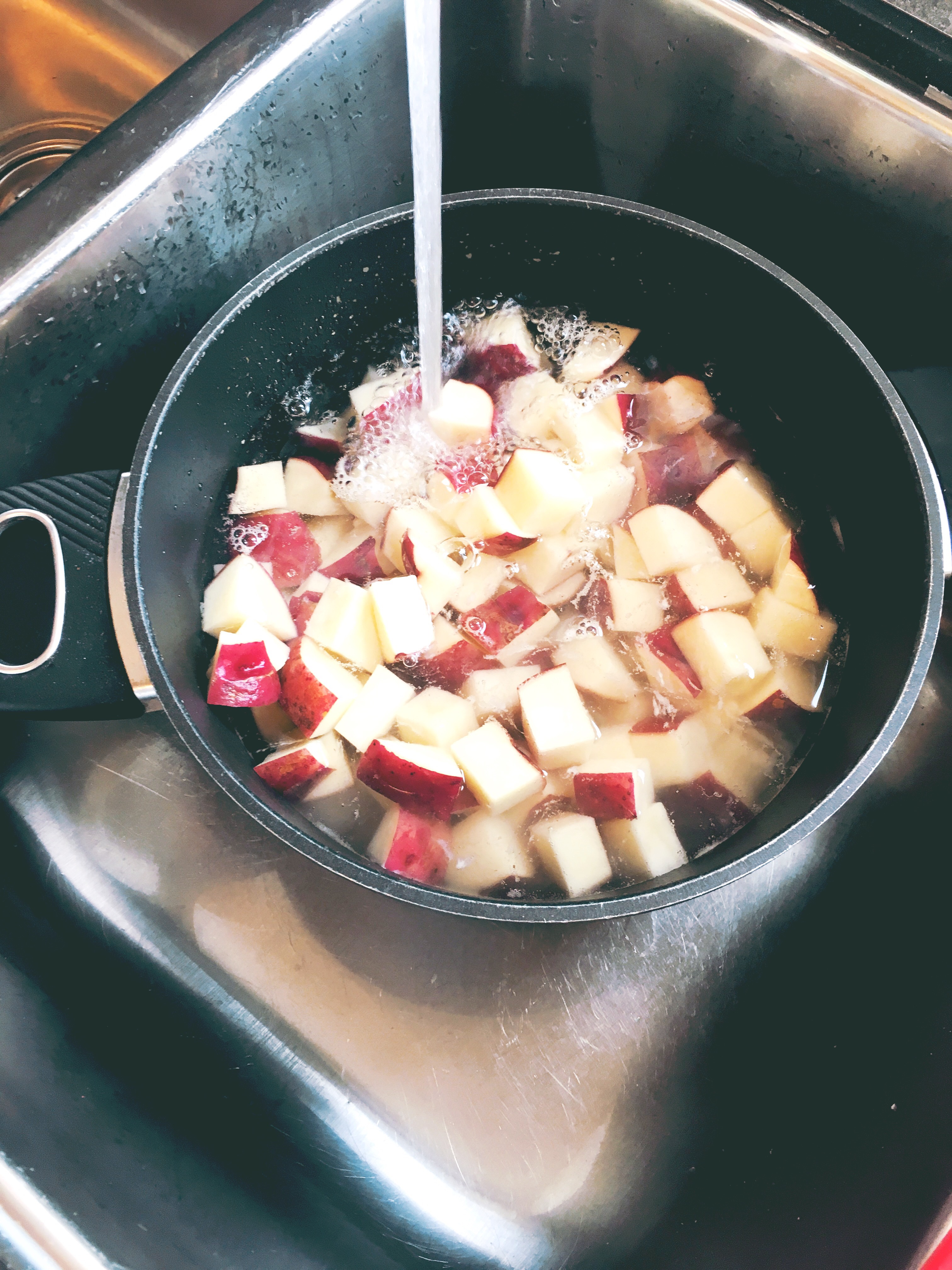 - boil potatoes in water with salt until they are just tender – but not mushy