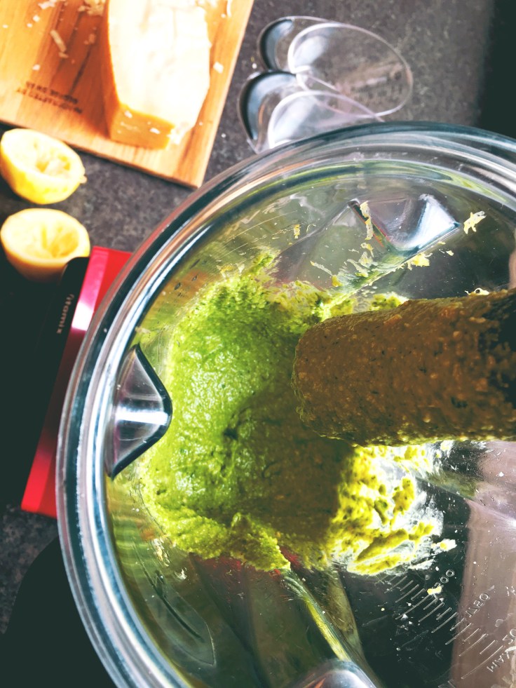 I made the arugula pesto in my Vitamix because I do not own a food processor (perhaps this Mother’s Day I’ll strike it rich and get one!!! fingers crossed…)
