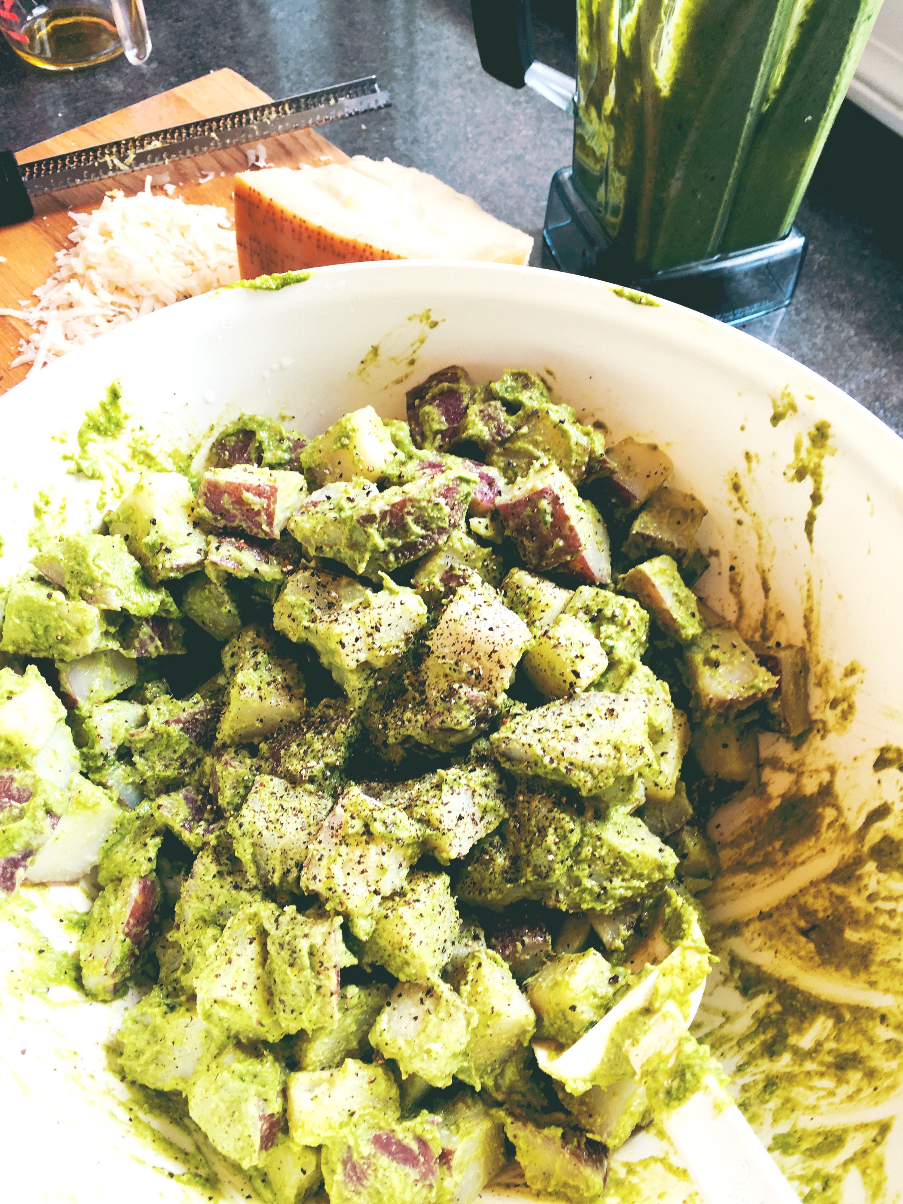 - add pesto to potatoes until you have as much on the potatoes as you like