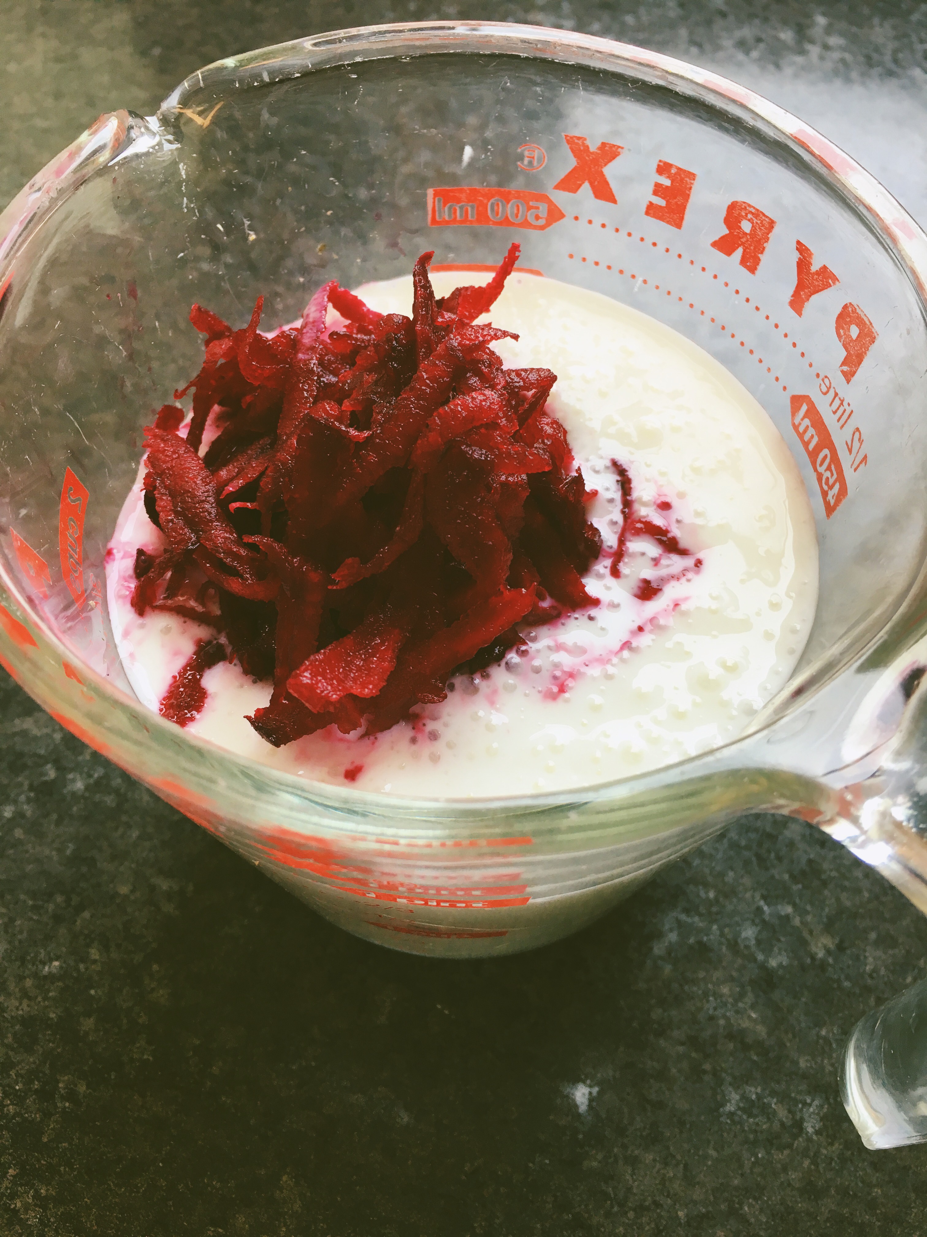 • place beets in the buttermilk and allow to sit while mixing other ingredients