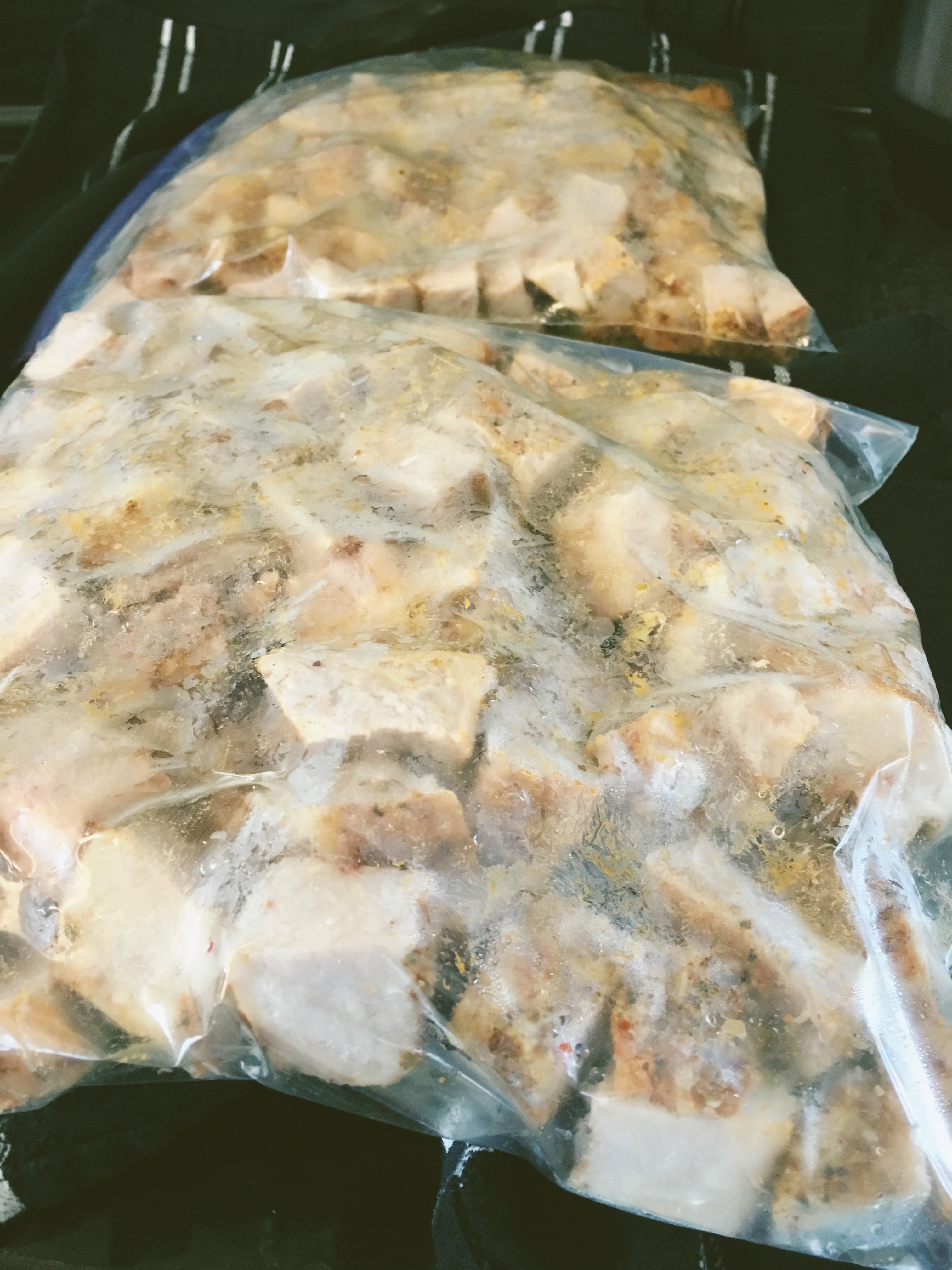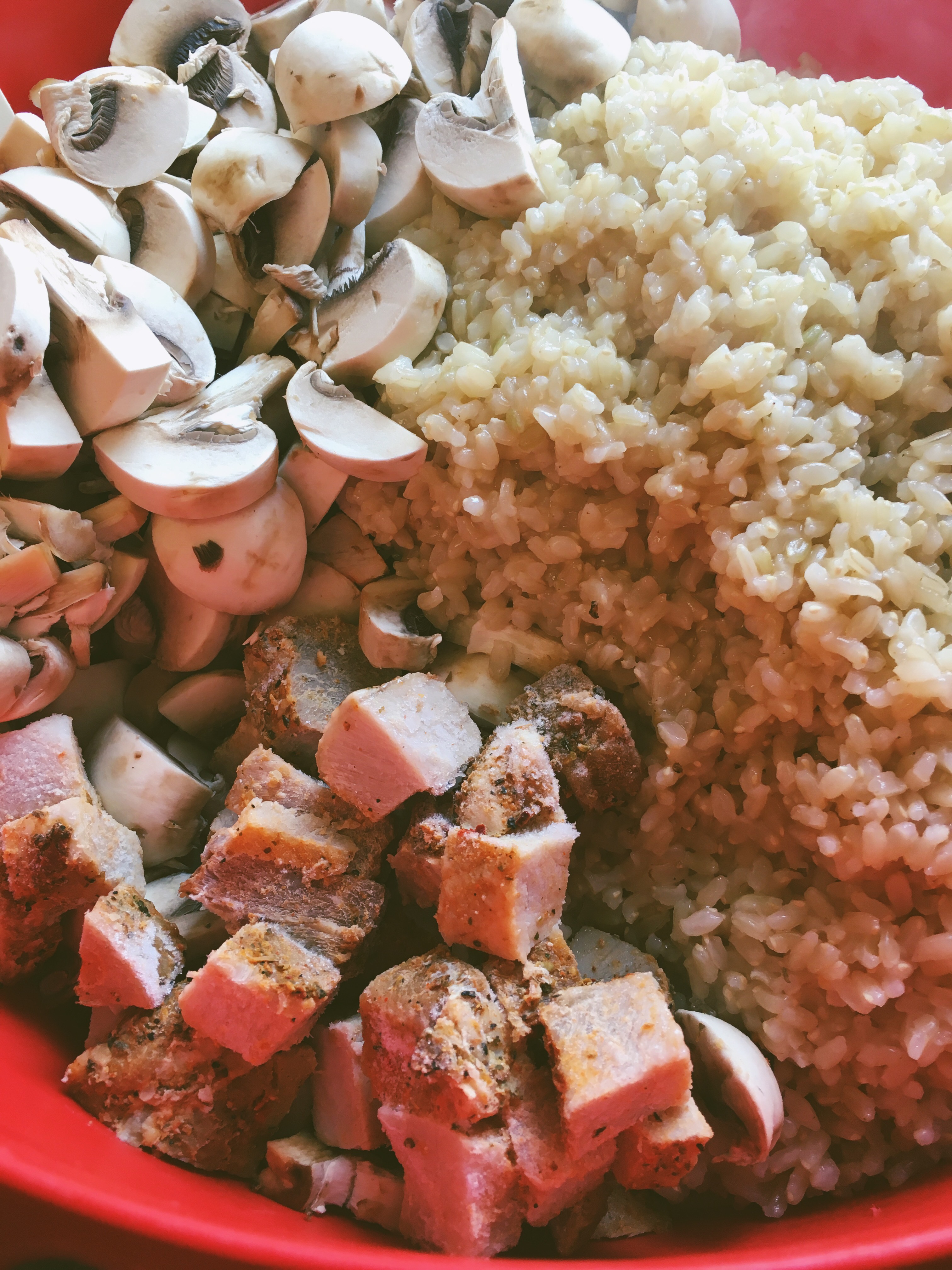 I had previously chopped and cooked up these pork chops and froze them so they wouldn’t go bad (when I was waiting for harvest to start)…  so I just defrosted the pork, cooked the brown rice, chopped up some mushrooms and mixed everything up with the mushroom soup…