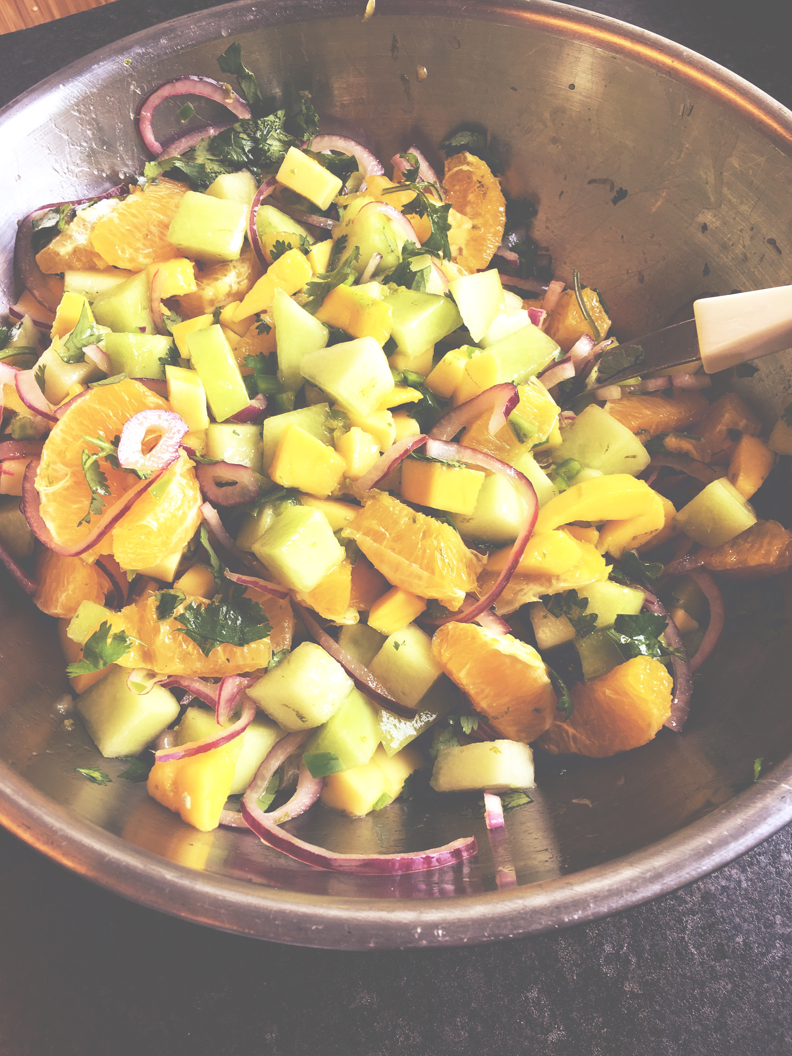 this fruit salad has cilantro, jalapeños and pickled red onion…