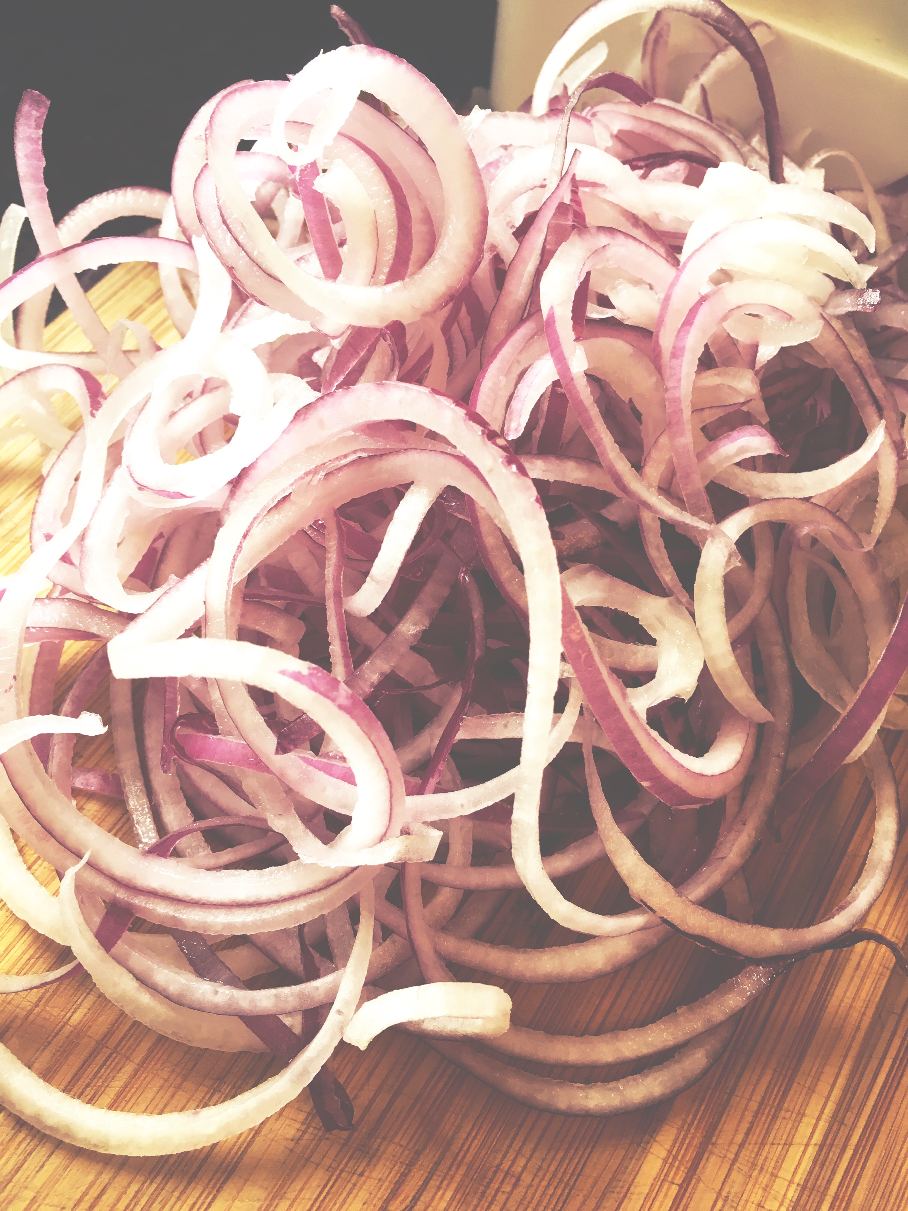 - cut up the fruit you have chosen to go in the salad and layer on top of the onions