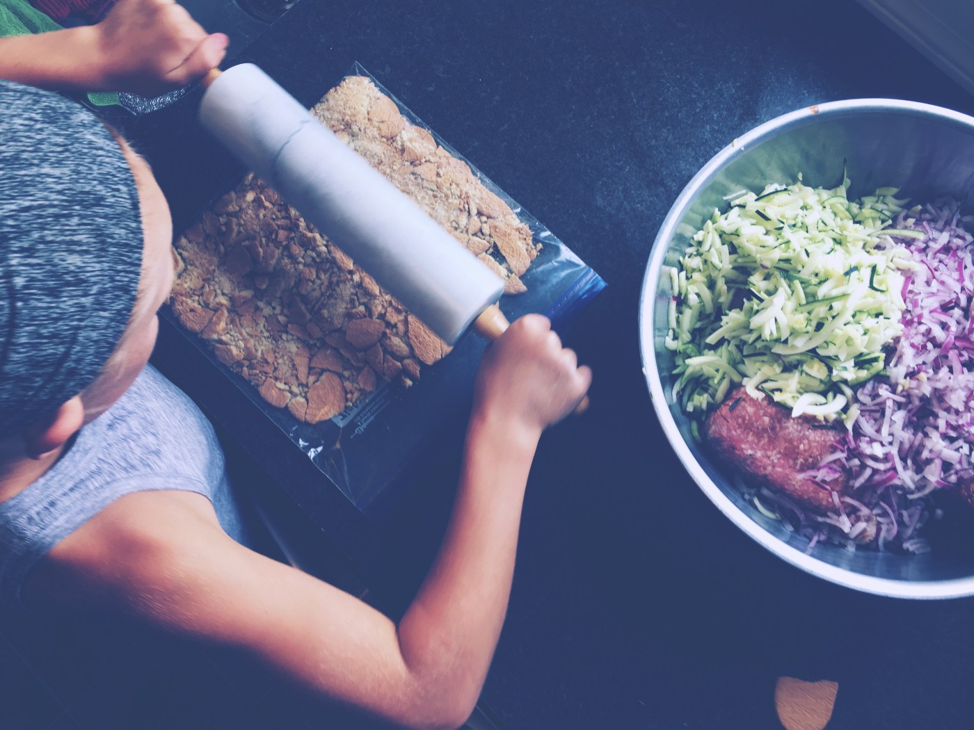 when you spiralize… you need to then chop to get them the right size for the meatballs… and then have good help to crush some Arrowroot cookies to bind the mixture