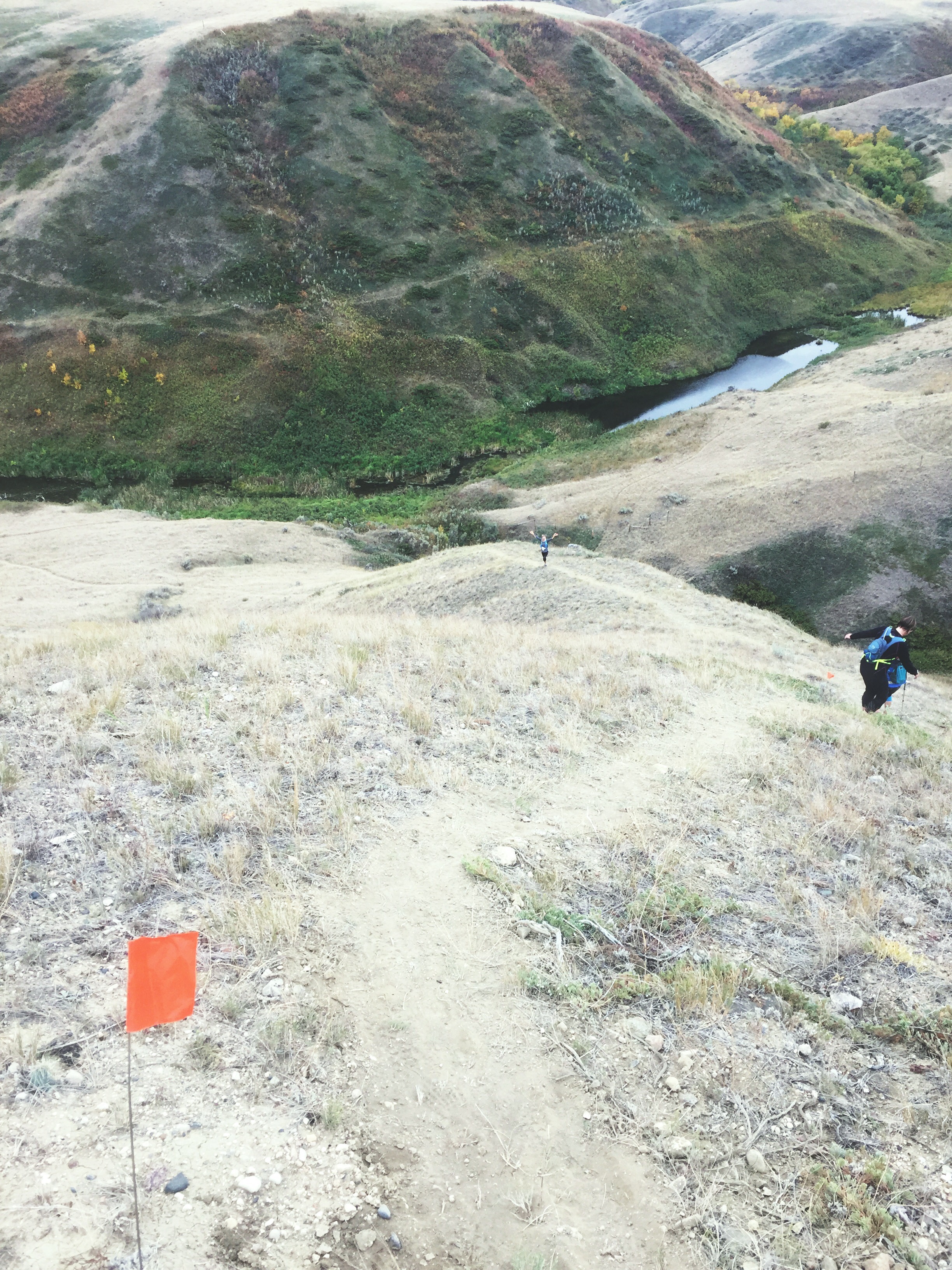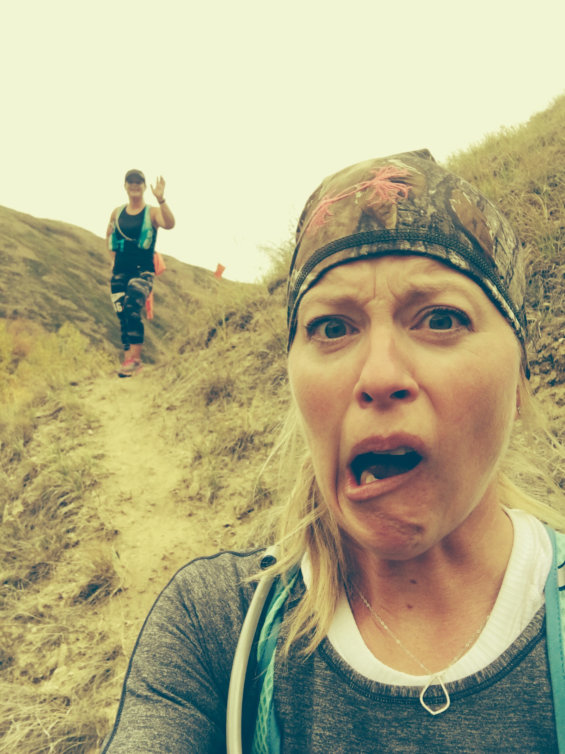 with the way my knee was, Jocelyn and I ended up passing each other on every hill… I would power hike the hills, with my hands on my knees, and then shuffle/run at the top and either slide on my butt or gingerly tiptoe down the hill, while she would blow by me… after doing this for hours on end we got into a certain rhythm with it!