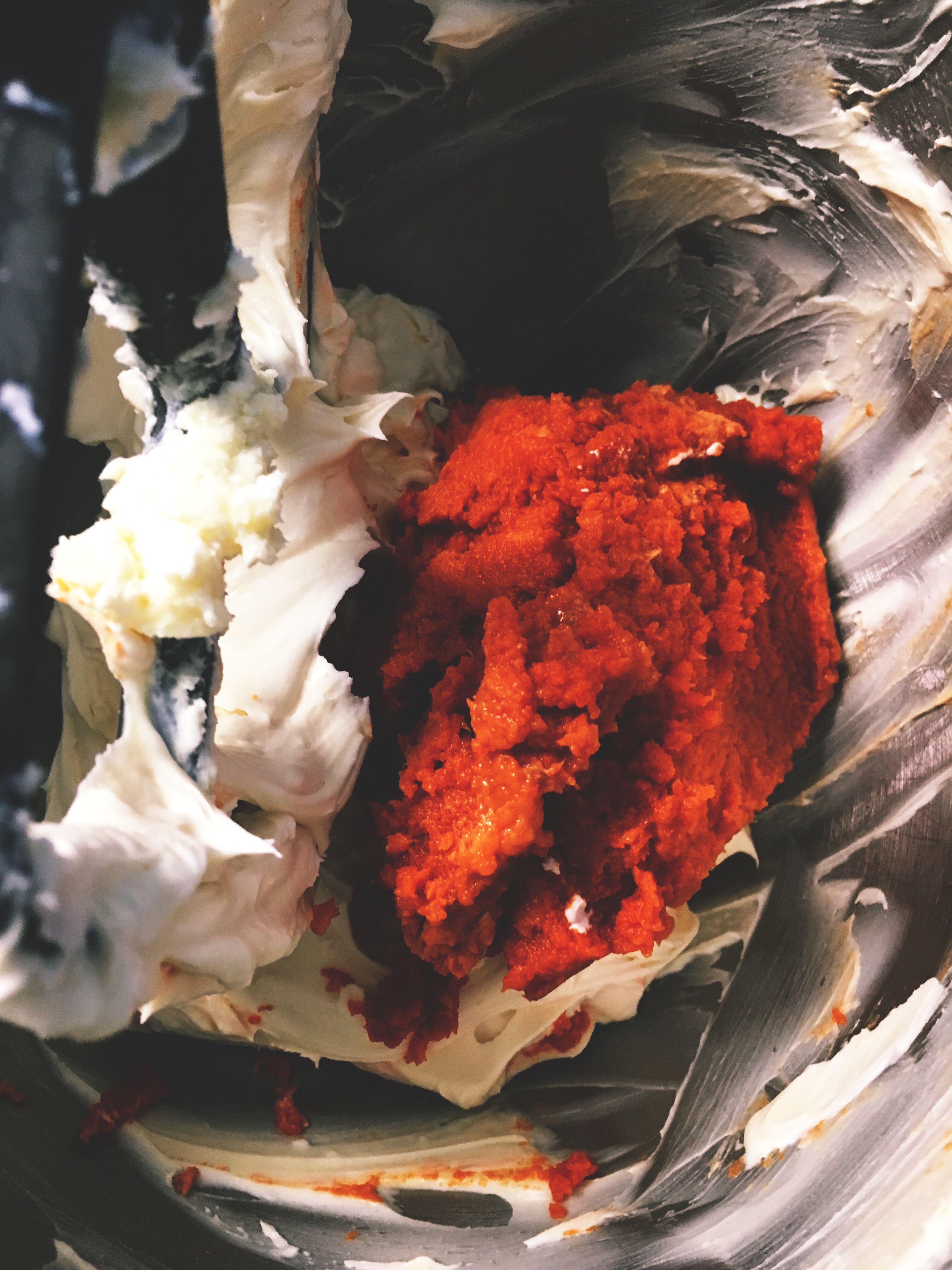 - add pumpkin puree, vanilla and cream and mix again, scraping down sides