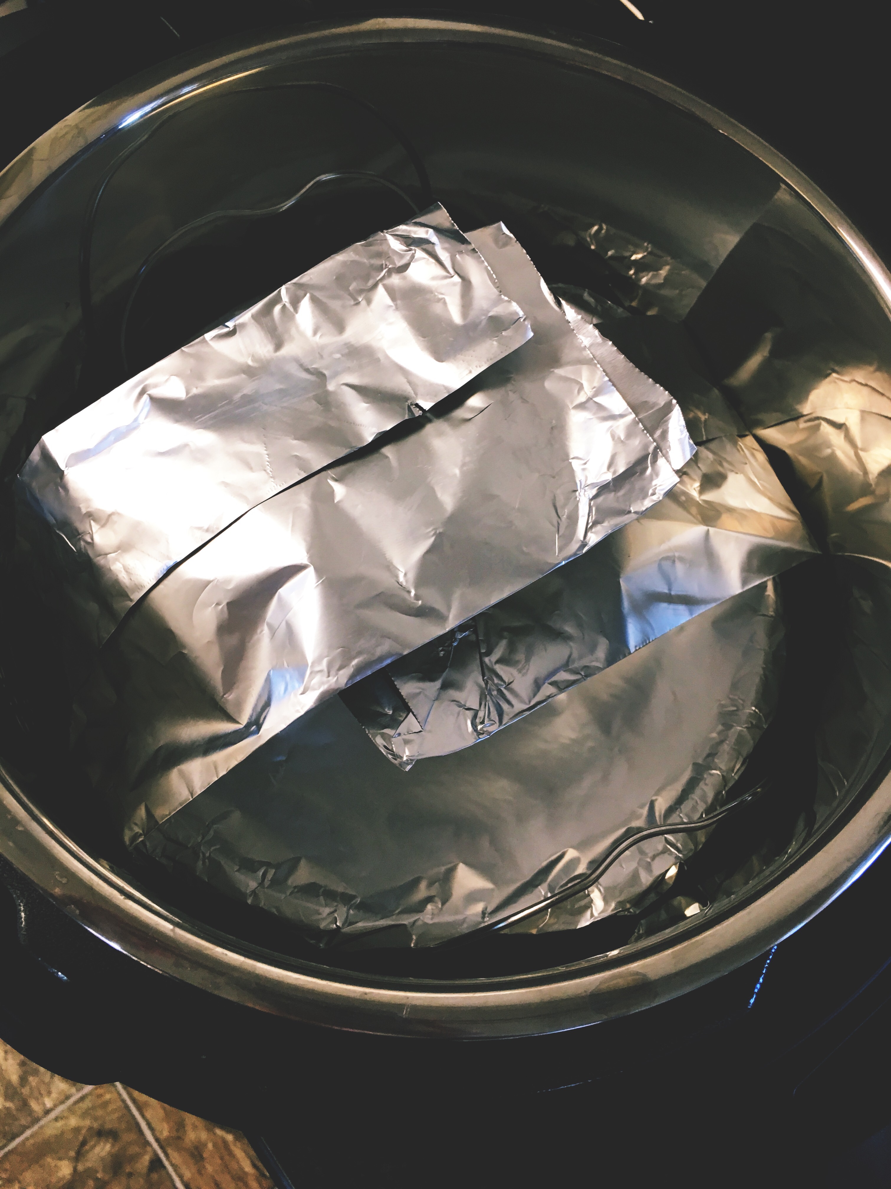 covering the cake with paper towel and foil was an interesting step… and away she goes into the Instant Pot…