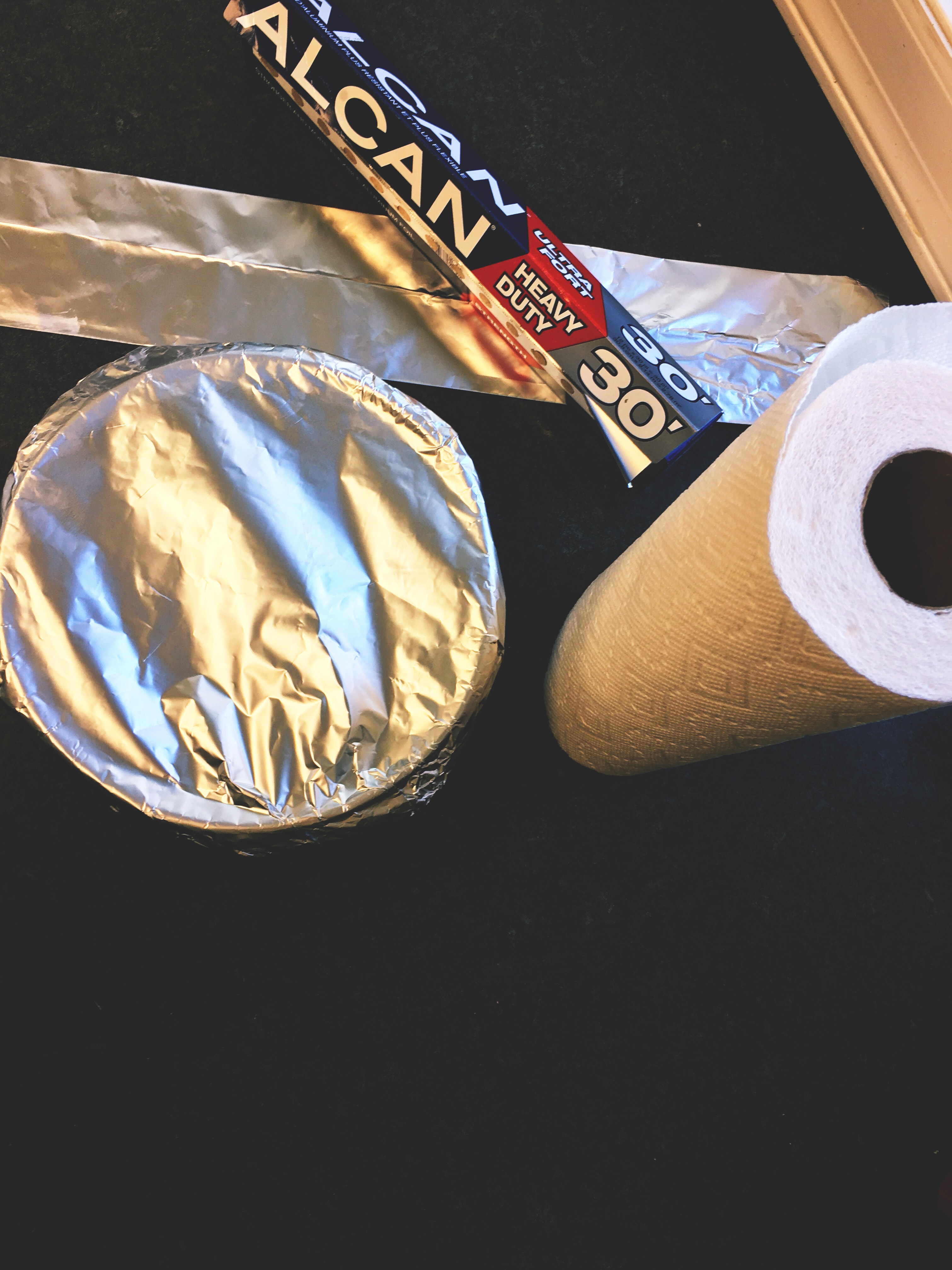 - cover the pan with paper towel and tin foil, crimping the edges around the pan