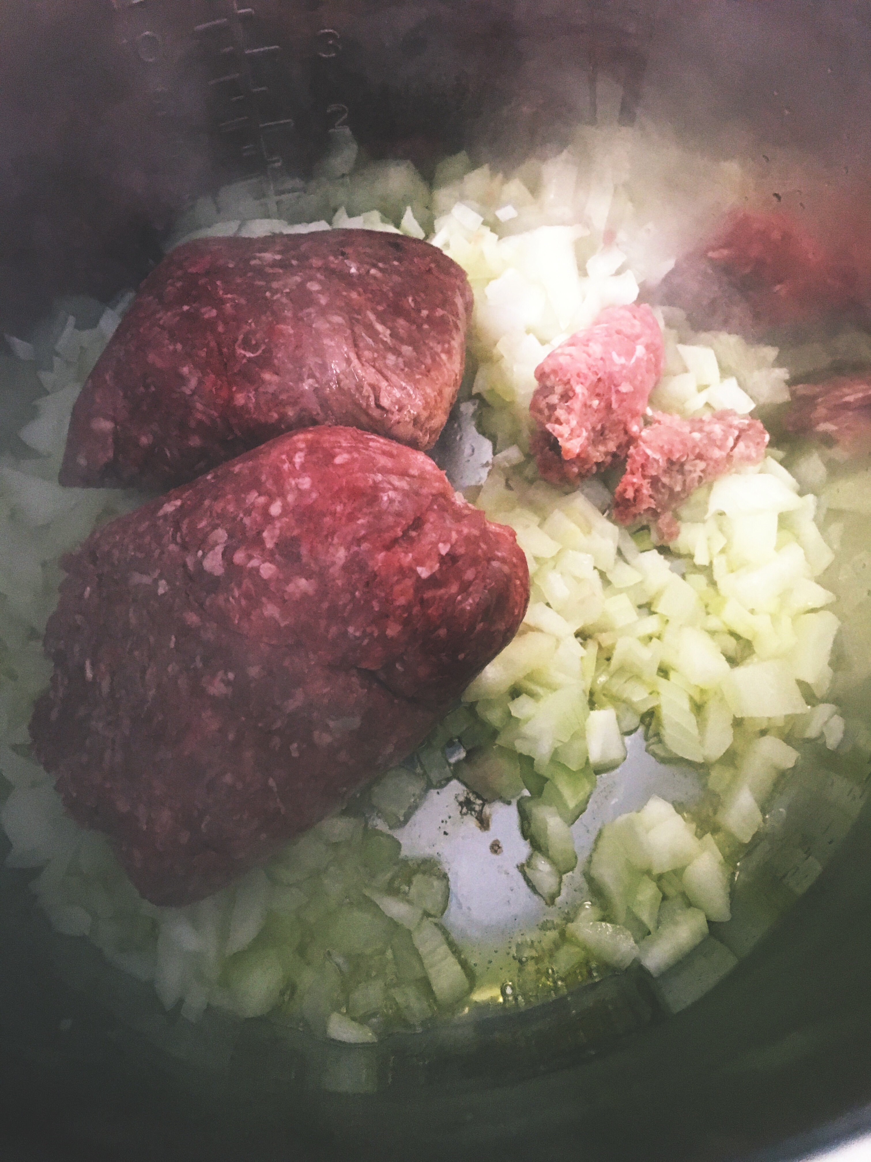 when they start to cook add your ground beef… brown it and strain if it is fatty…