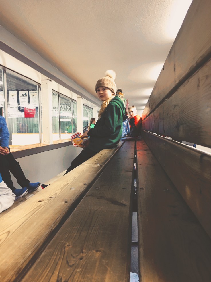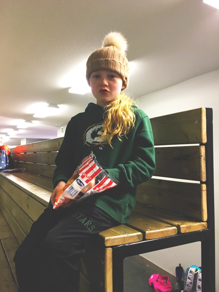 as I came in the rink I quickly found my daughter eating Cheezies at 10 am in the morning… (this is another reason why I work the booth – to keep her from making these types of decisions)