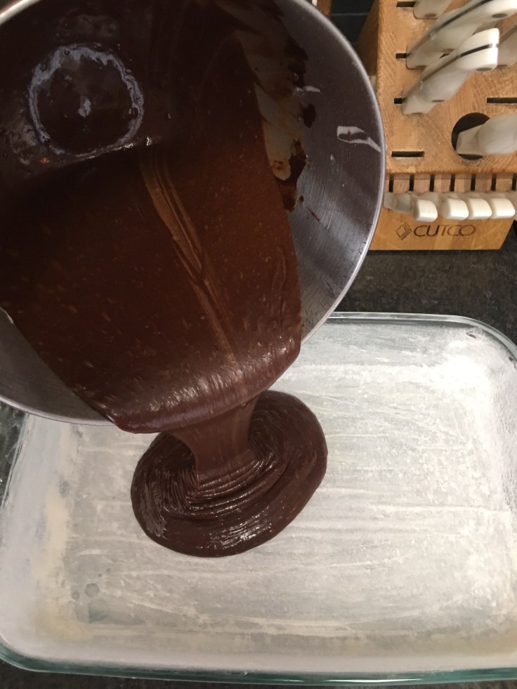 after mixing up the brownie mixture, you pour it into the baking pan… this is another thing I love to do… other than peel and chop garlic… prepare a baking dish with butter and flour… it reminds me of finger painting… not that I remember finger painting…