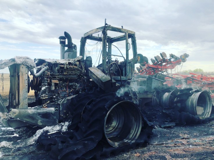 unfortunately this was one tractor fire that was not going to be put out with some fire extinguishers… the farmer was telling me that the heat put off by this fire was incredible… he never had felt heat like that… the tires exploded, the fuel tank exploded.. the tires and hoses on the drill melted… it was intense…